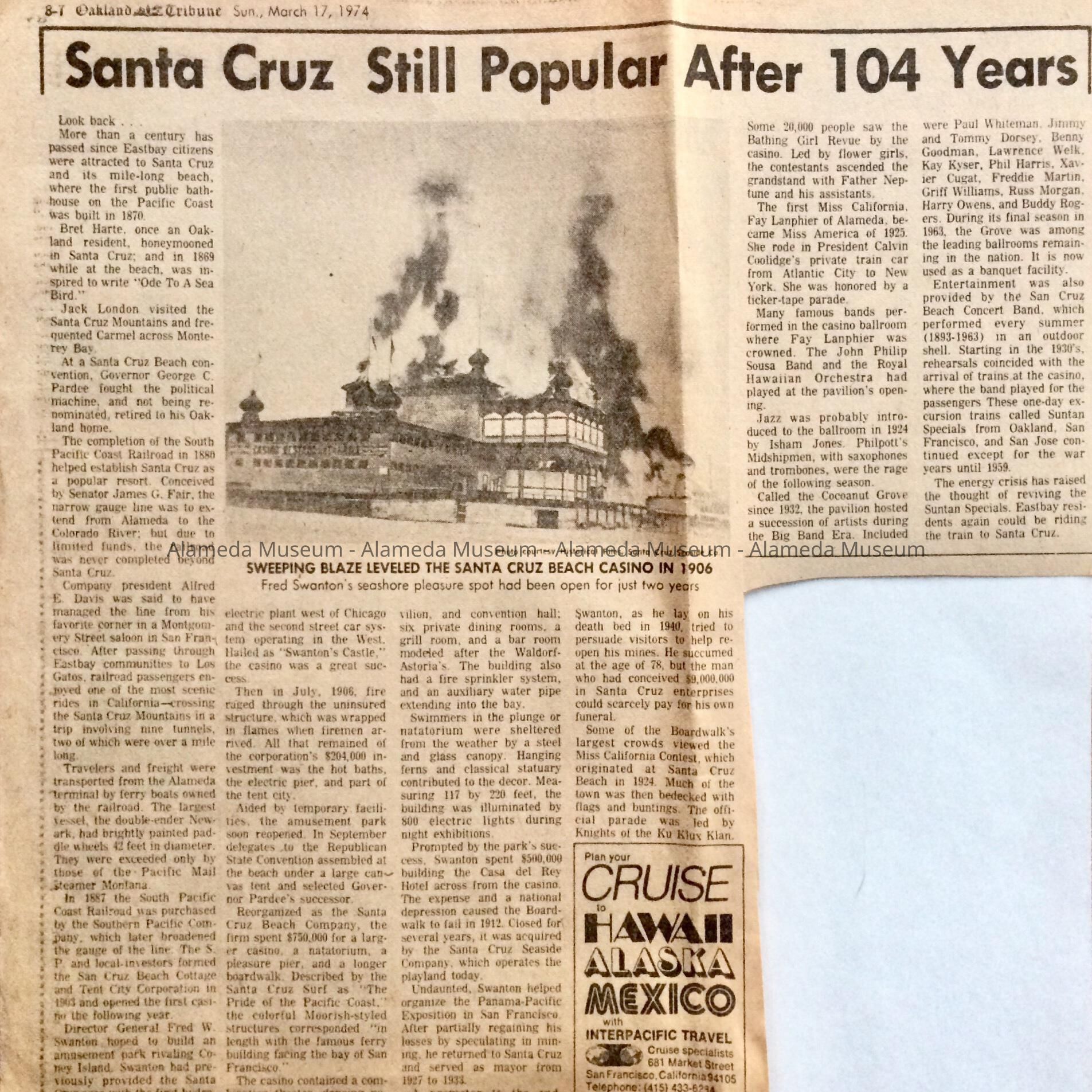 Description: Clipping, from the Oakland Tribune of March 17, 1974, of an article headlined 'Santa Cruz Still Popular After 104 Years'.