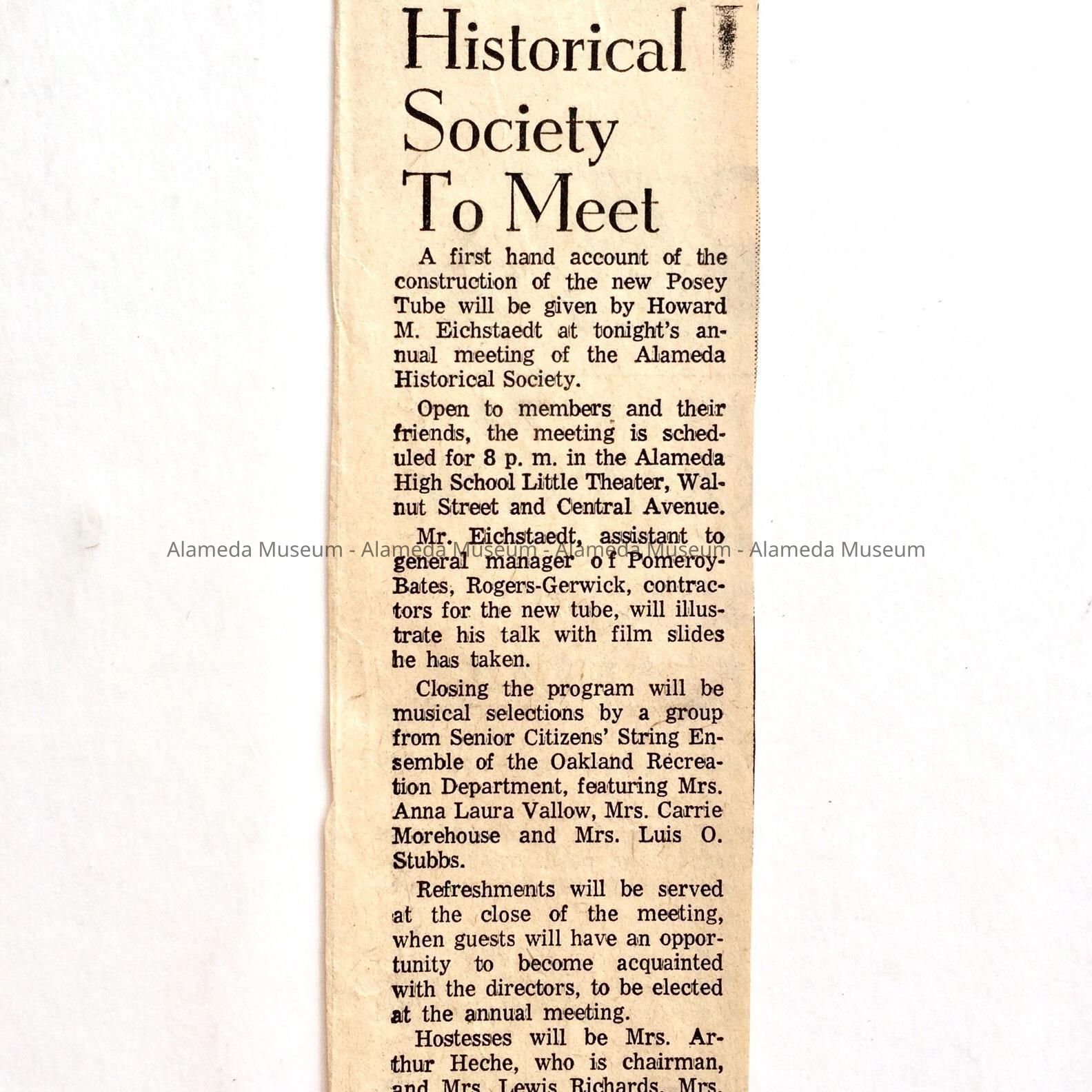 Newspaper clipping concerning talk that was given by a Howard M. Eichstaedt on the construction of the then-new Webster Street Tube. The talk was given to members of the Alameda Historical Society.