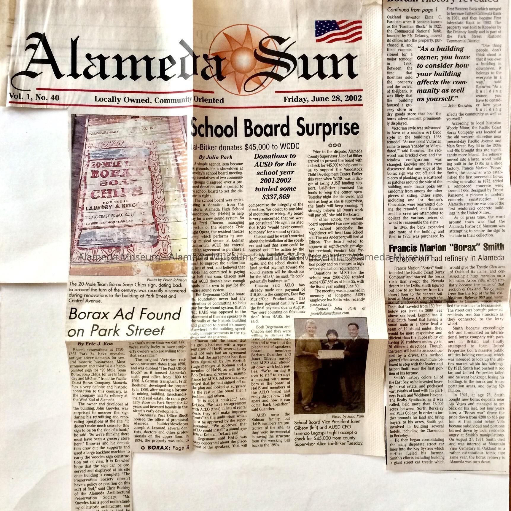 Description: Clipping of article on the front page of the Alameda Sun of June 28, 2002, with article 'Borax Ad Found on Park Street', by Eric J. Kos, continued on page 8.