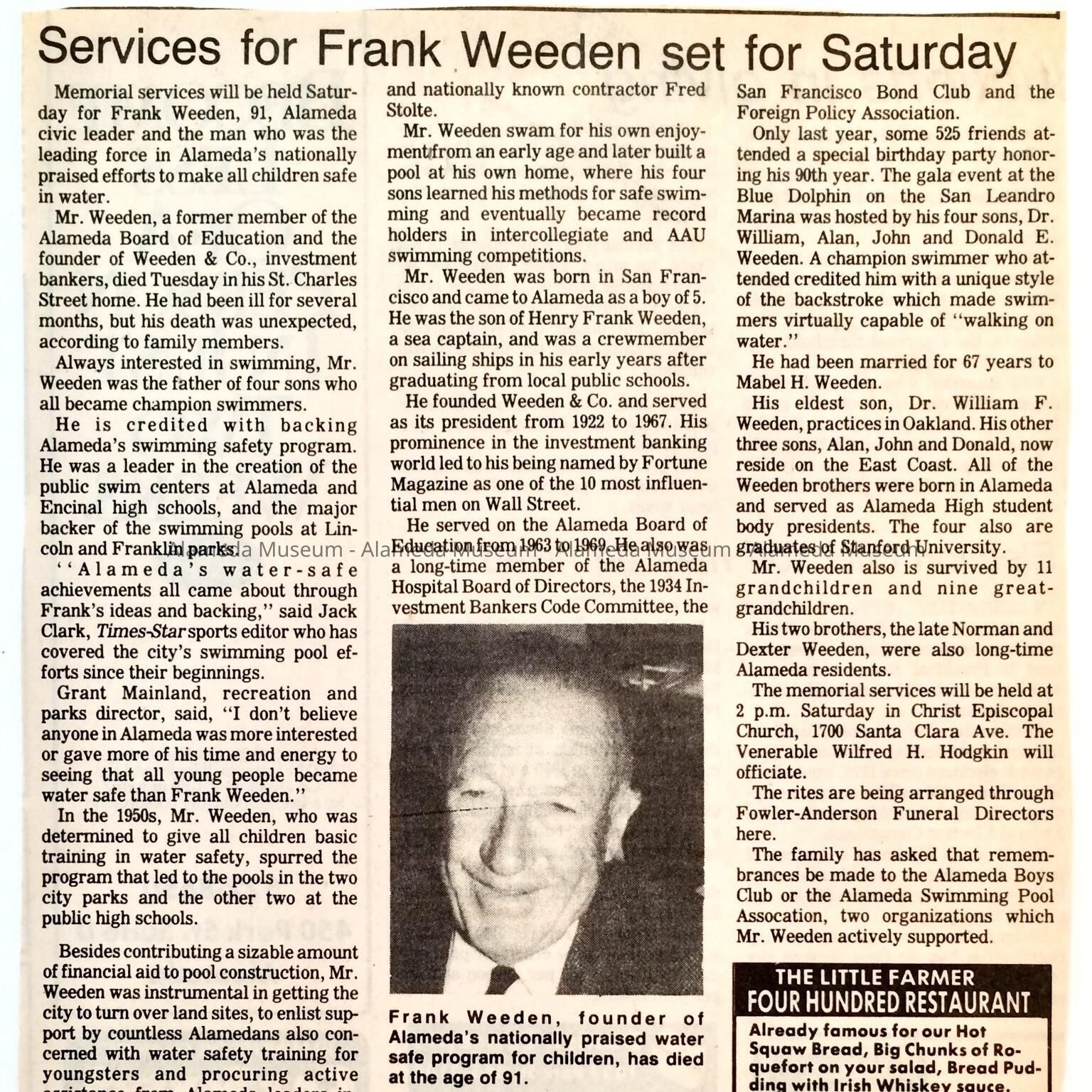 HISTORY OF OBJECT: A NEWSPAPER CLIPPING CONCERNING THE DEATH OF 91-YEAR OLD FRANK WEEDEN, WHO WAS AN ALAMEDA CIVIC LEADER. HE WAS MEMBER OF THE ALAMEDA BOARD OF EDUCATION AND WAS VERY INTERESTED IN WATER SAFETY AND TEACHING CHILDREN TO SWIM.