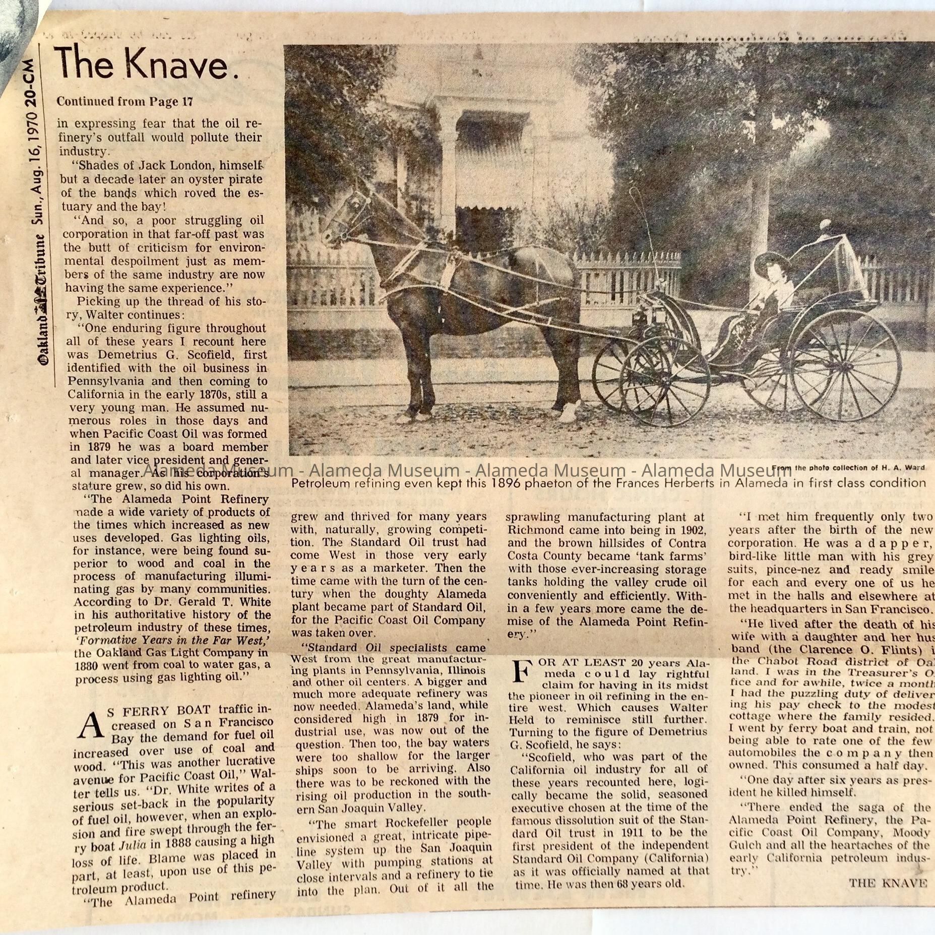 History: Clipping from the History Section known as the Knave of the Oakland Tribune dated August 16, 1970. The article concerns the Pacific Coast Oil Company of the West End, a pioneer industry of the City. The article also includes an illustration of their plant at Alameda Point.