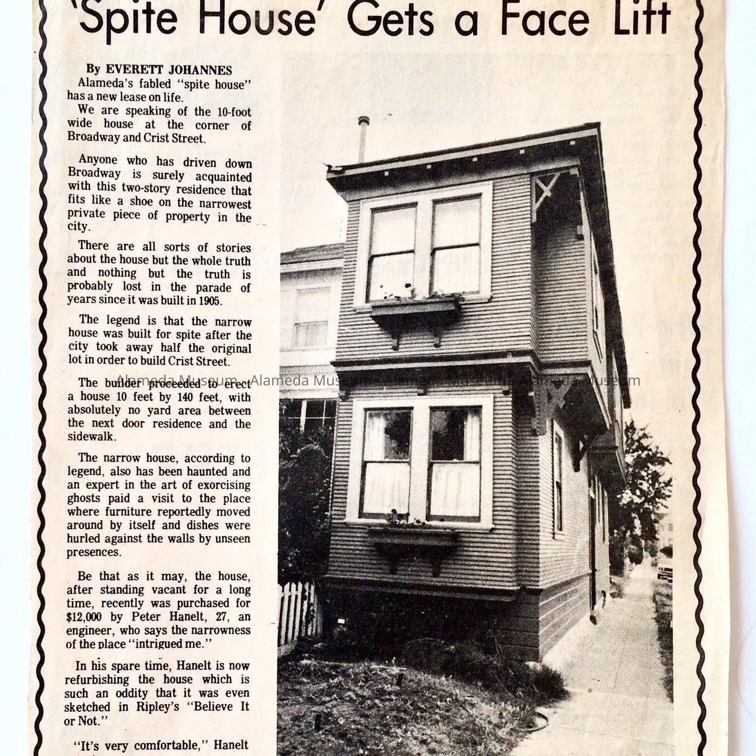 History: Newspaper clipping which appeared in the Alameda Times Star, July 11,1972, concerning the famous Spite House at the corner of Broadway and Crist.