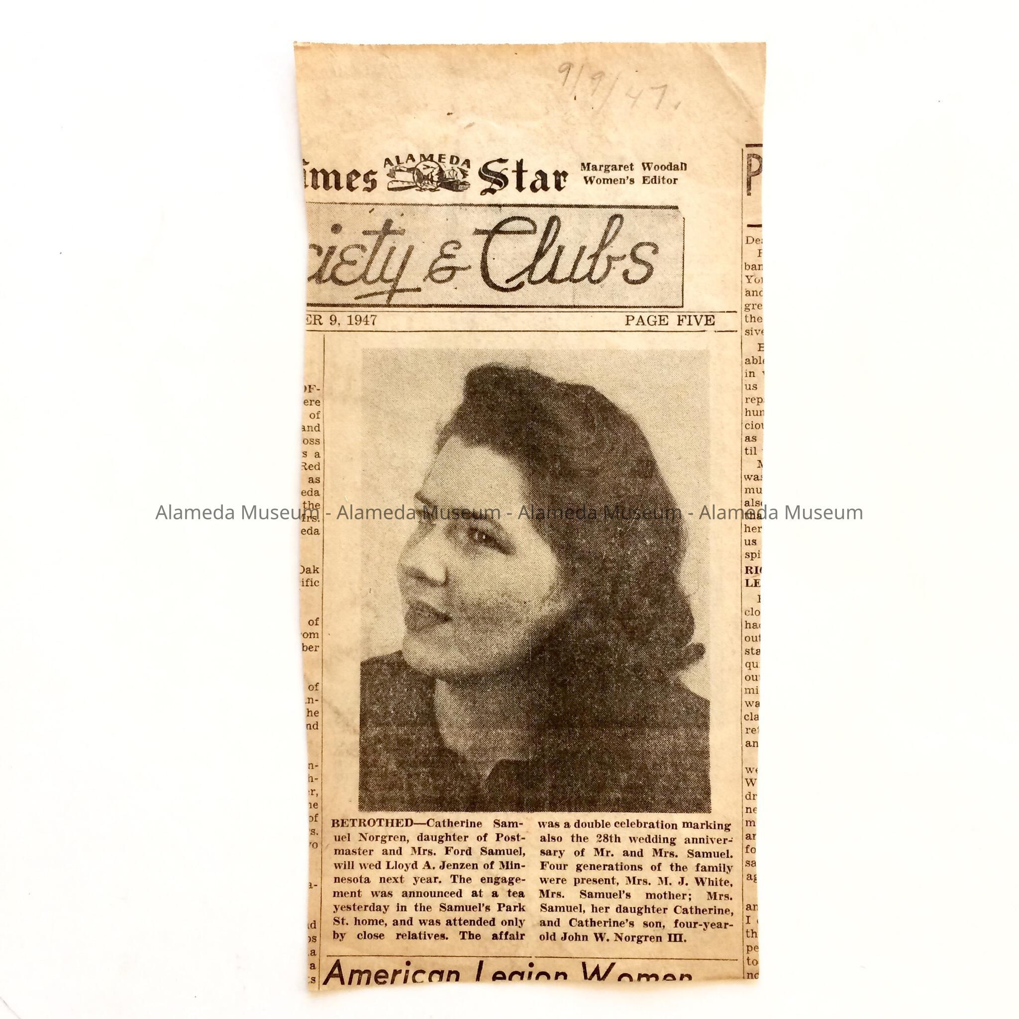 HISTORY OF OBJECT: NEWSPAPER CLIPPING, WITH PORTRAIT OF CATHERINE SAMUEL NORGREN, DAUGHTER OF POSTMASTER FORD SAMUEL. CLIPPING ANNOUNCES HER WEDDING TO LLOYD A JENZEN OF MINNESOTA.