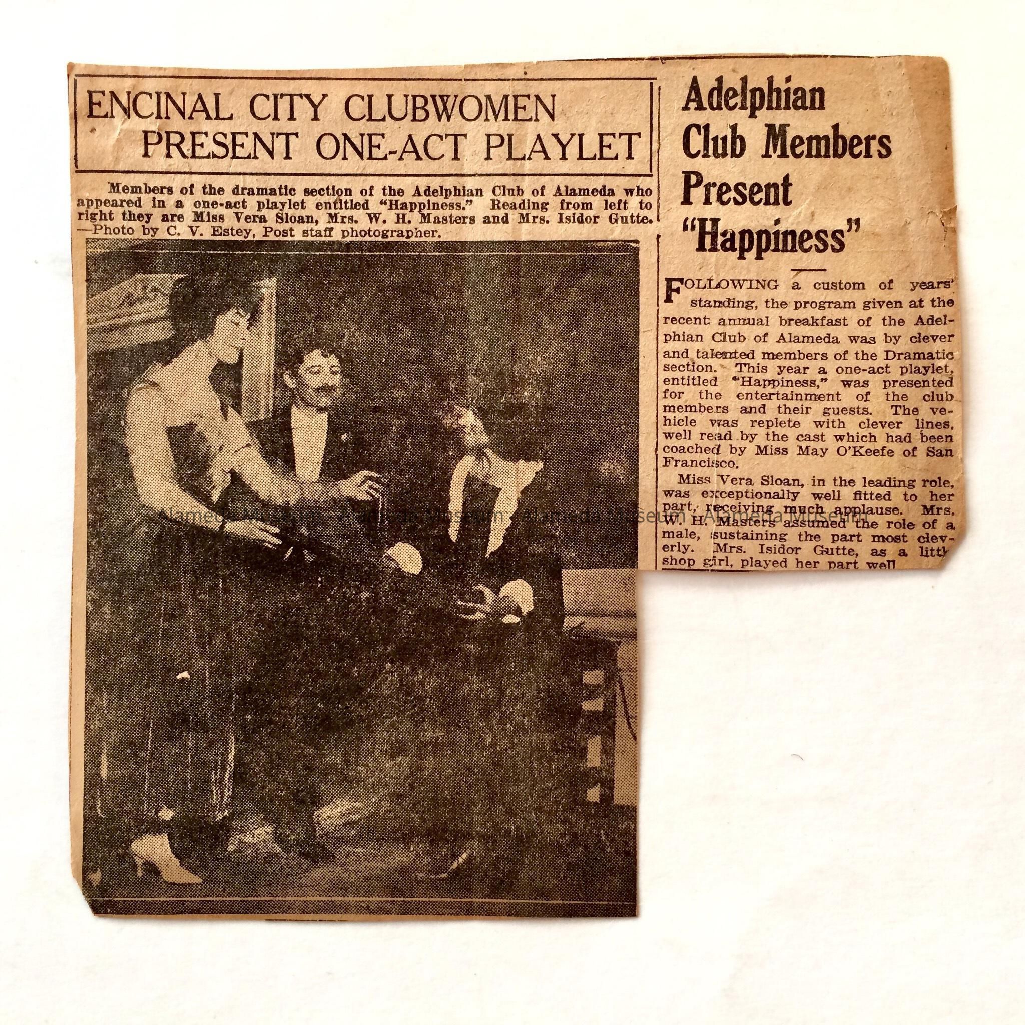 AN ILLUSTRATED NEWSPAPER CLIPPING CONCERNING A PLAY ENTITLED, "HAPPINESS," PRESENTED BY THE DRAMATIC SECTION OF THE ADELPHIAN CLUB.