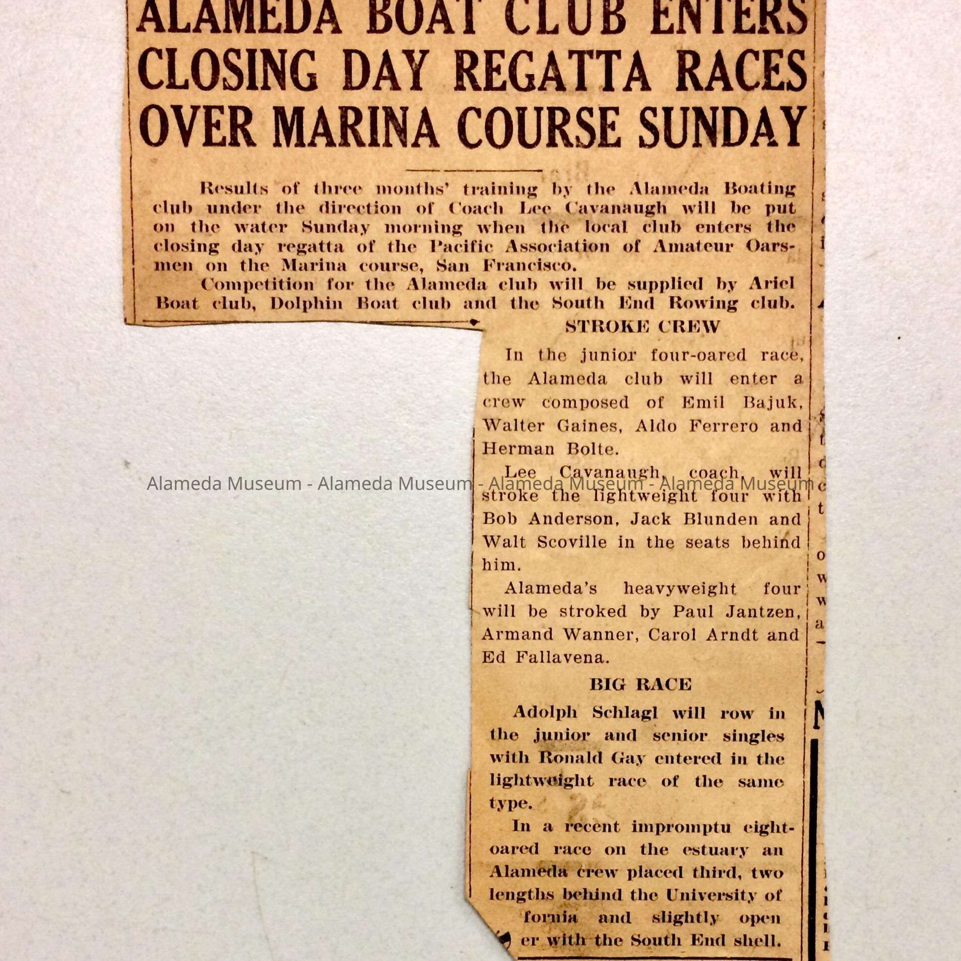 A NEWSPAPER CLIPPING CONCERNING RACING COMPETITION WHICH THE ALAMEDA BOATING CLUB HAD ENTERED. CLIPPING ALSO INCLUDES THE NAMES OF THE PARTICIPANTS. LEE CAVANAUGH WAS COACH. RESULTS OF THE RACE ARE UNKNOWN.