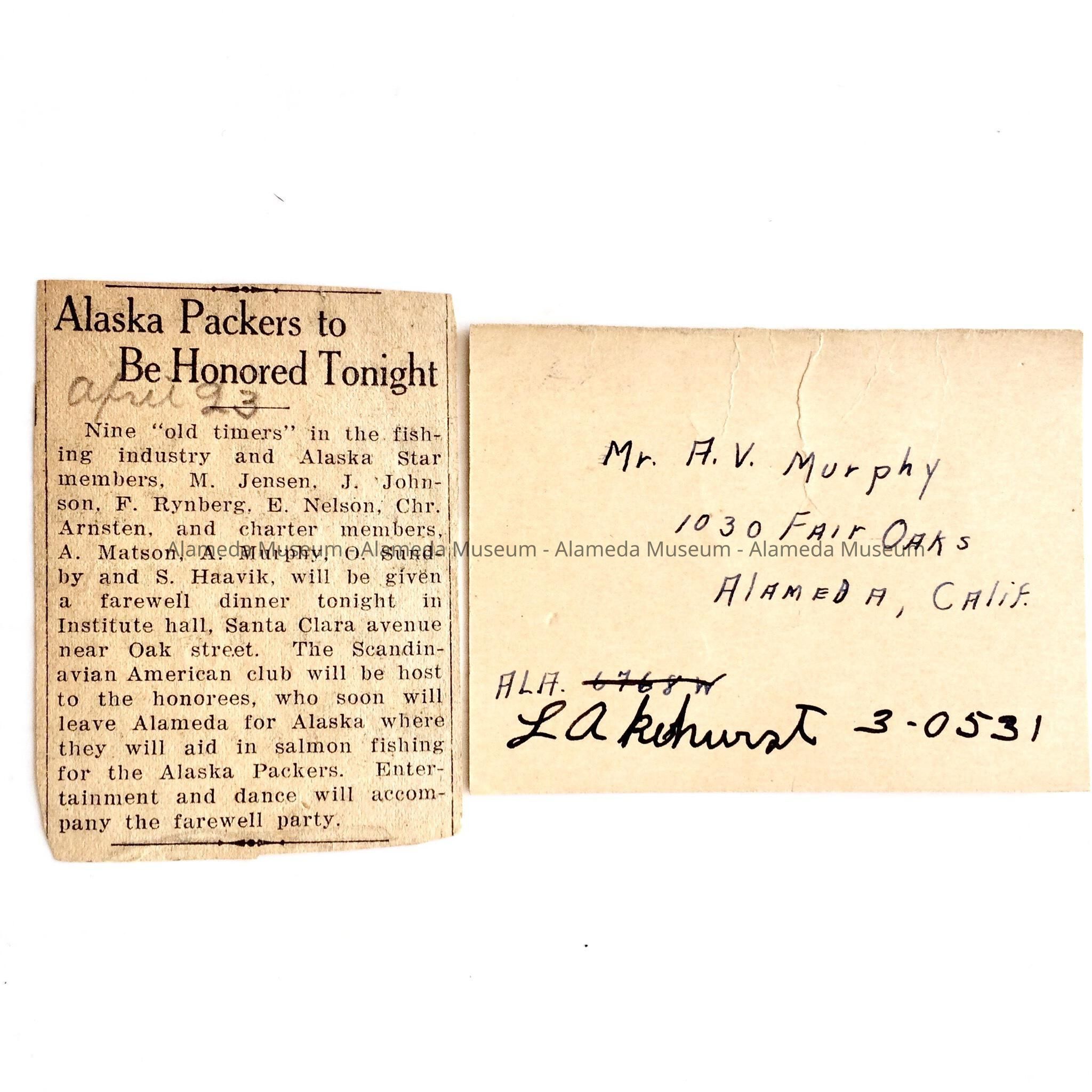 Clipping 'Alaska Packers to be Honored Tonight', prior to 1971Entry/Object ID