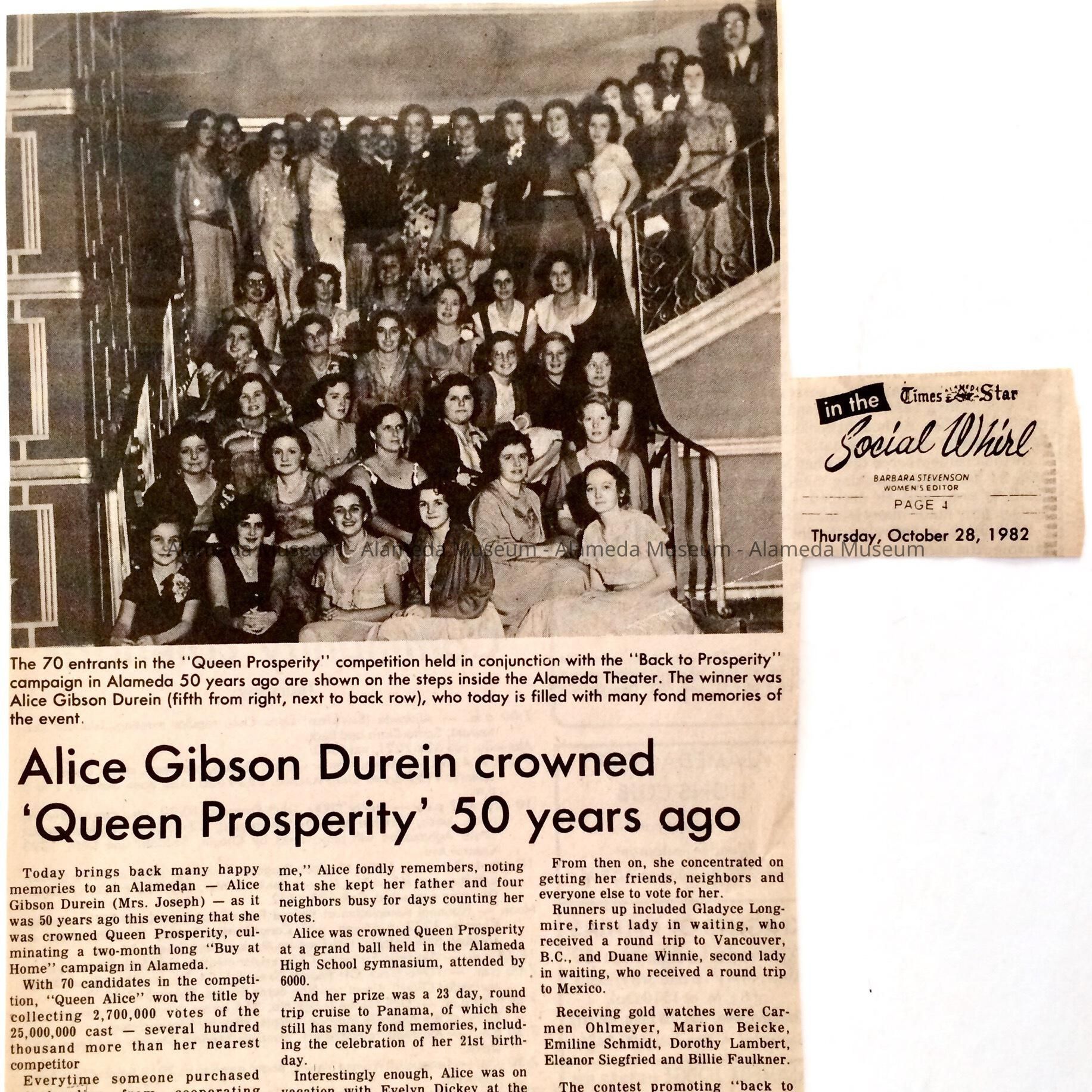 A NEWSPAPER CLIPPING FROM THE ALAMEDA TIMES-STAR, OCTOBER 8, 1982, CONCERNING THE LATE ALICE GIBSON DUREIN, WHO WAS WINNER OF A CONTEST THAT OCCURRED IN 1932 DURING THE DEPRESSION. CANDIDATES RECEIVED VOTES AFTER PURCHASING MERCHANDISE FROM LOCAL MERCHANTS.