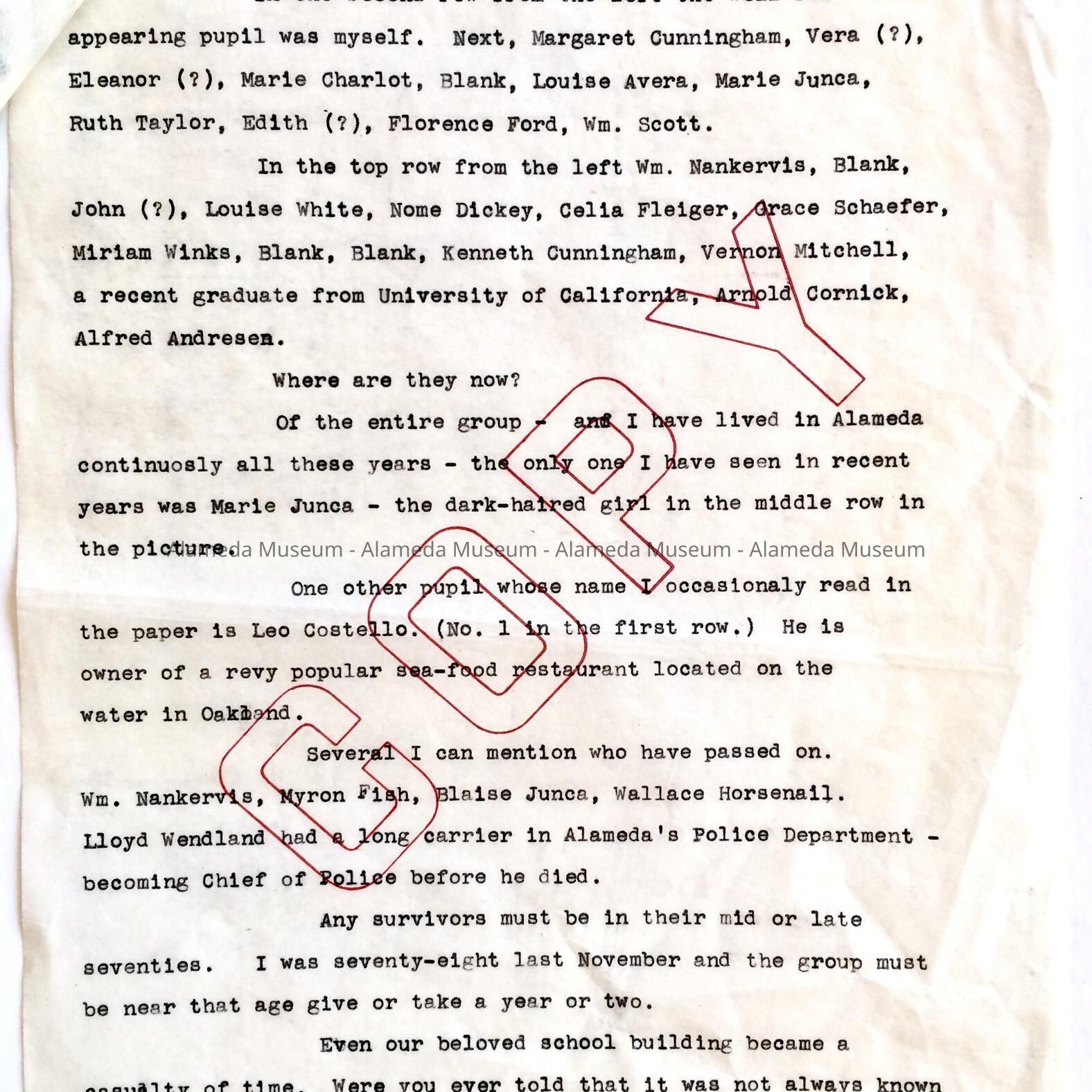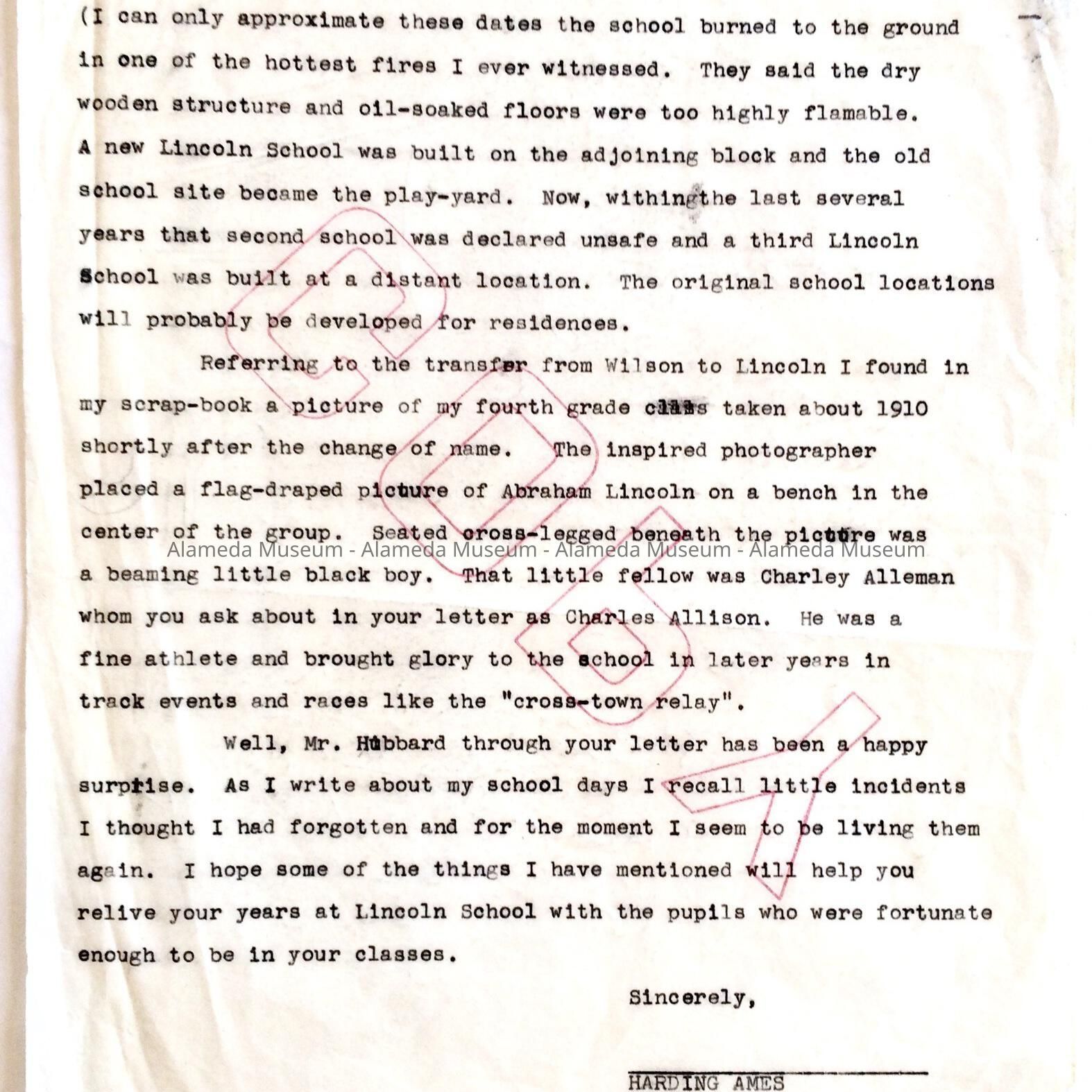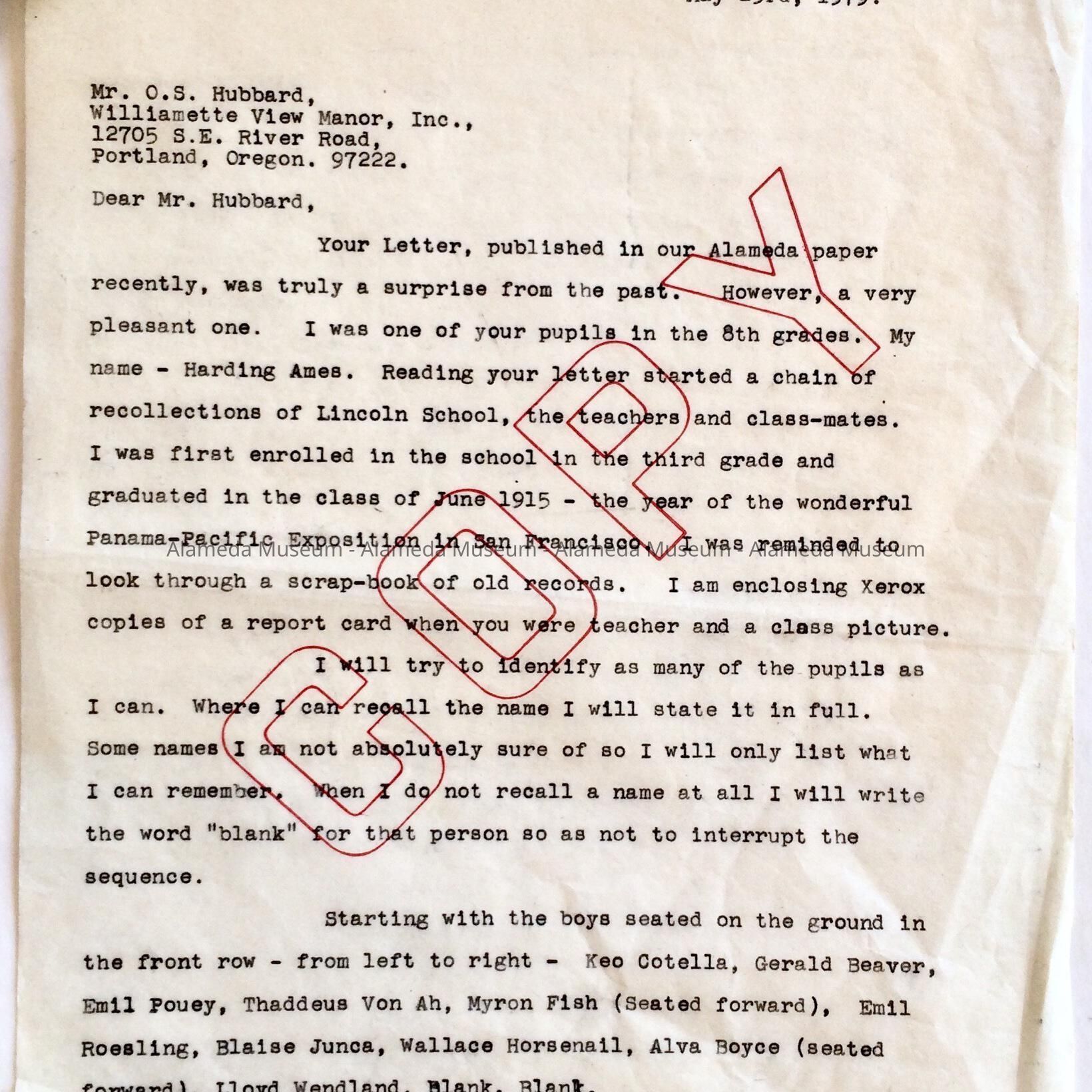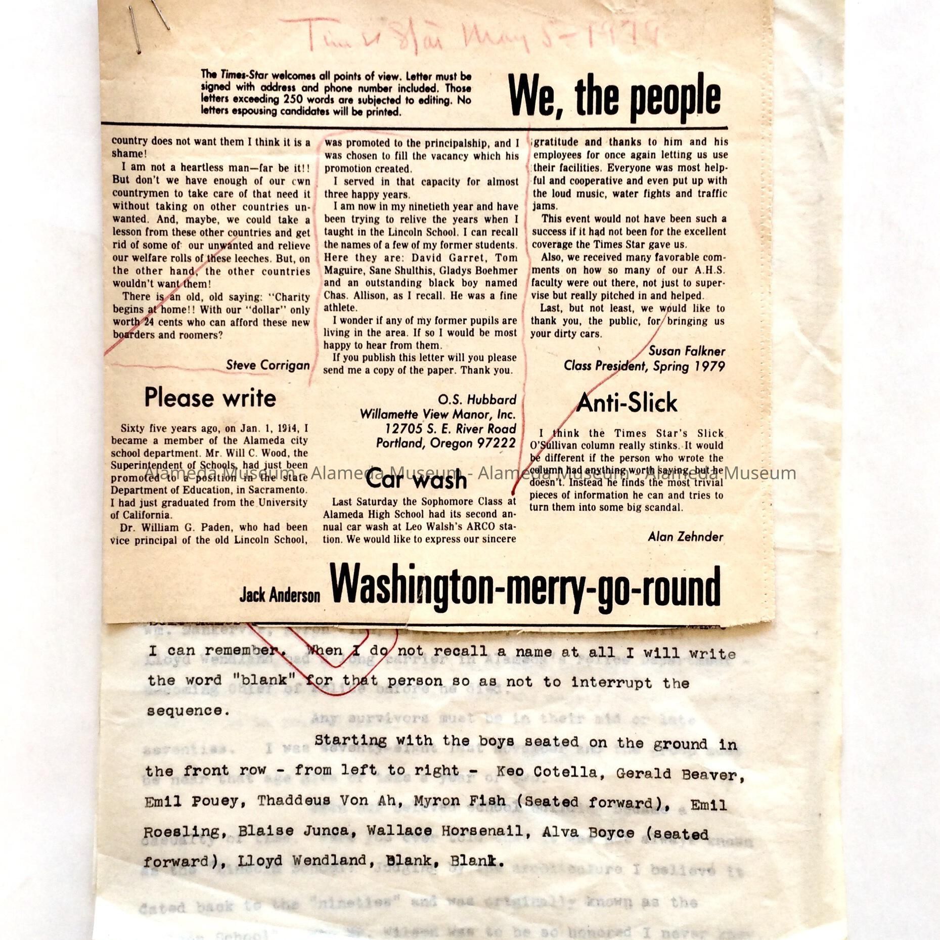 History: Clipping from the editorial page, Alameda times-Star dated 5/5/79 in which O.S. Hubbard, a form teacher at Lincoln School requests information on former students. Attached to the clipping is a 3-page letter composed by the donor in which he relates early events of Lincoln School.
