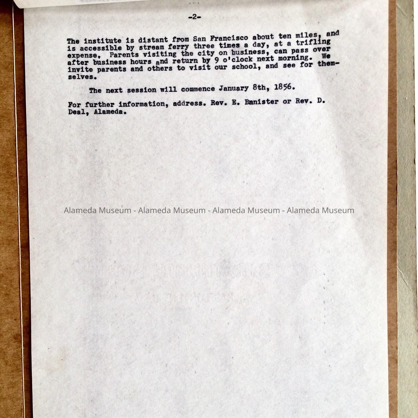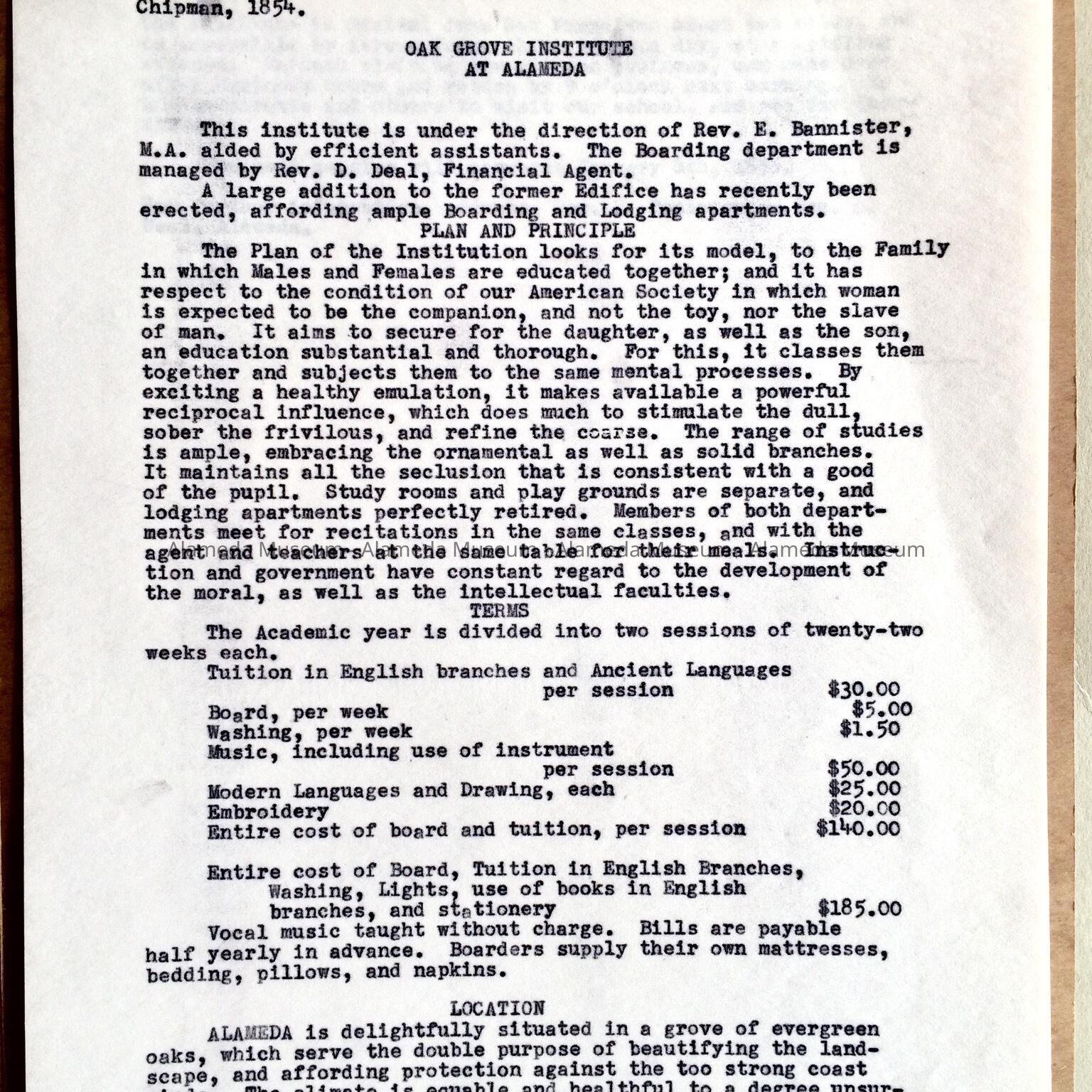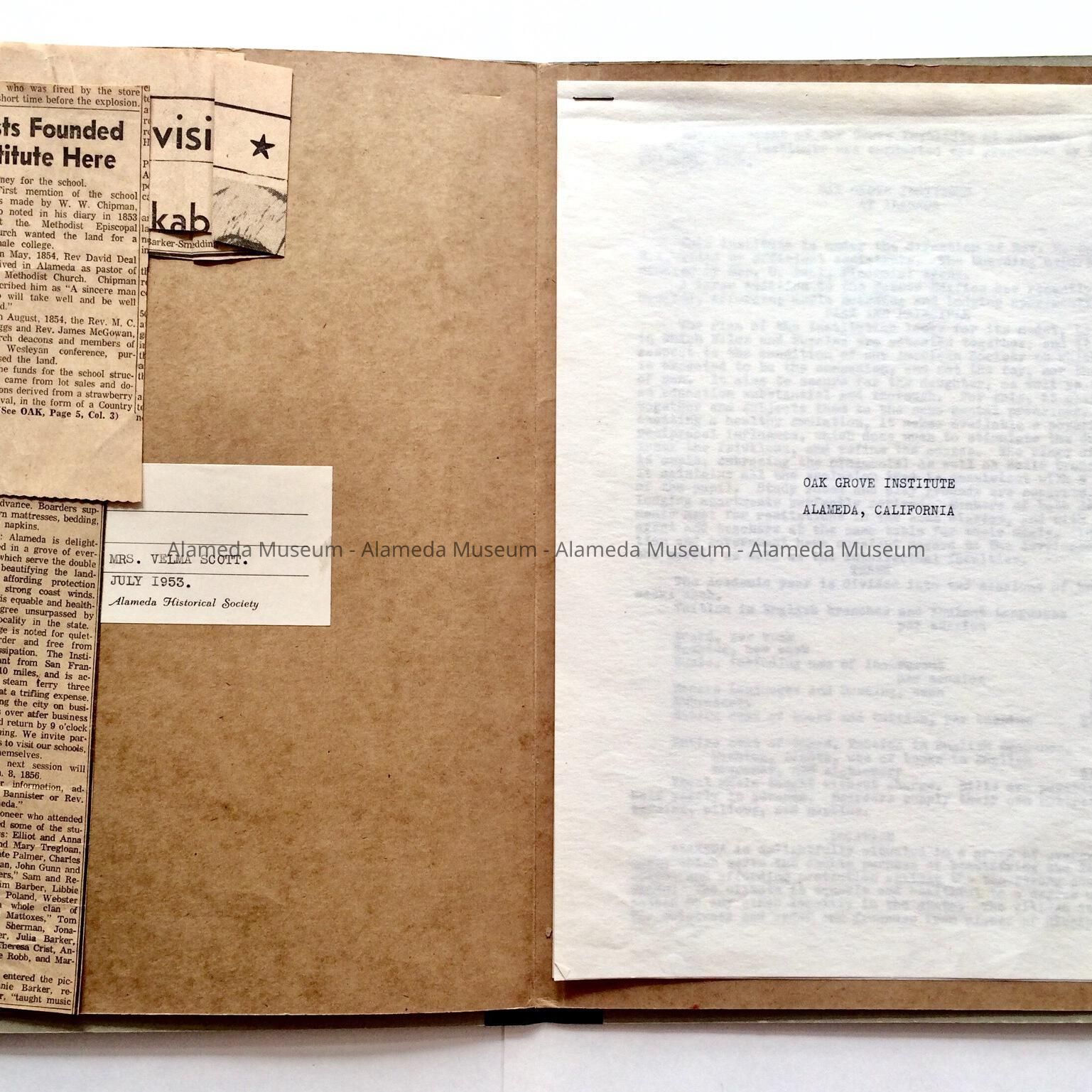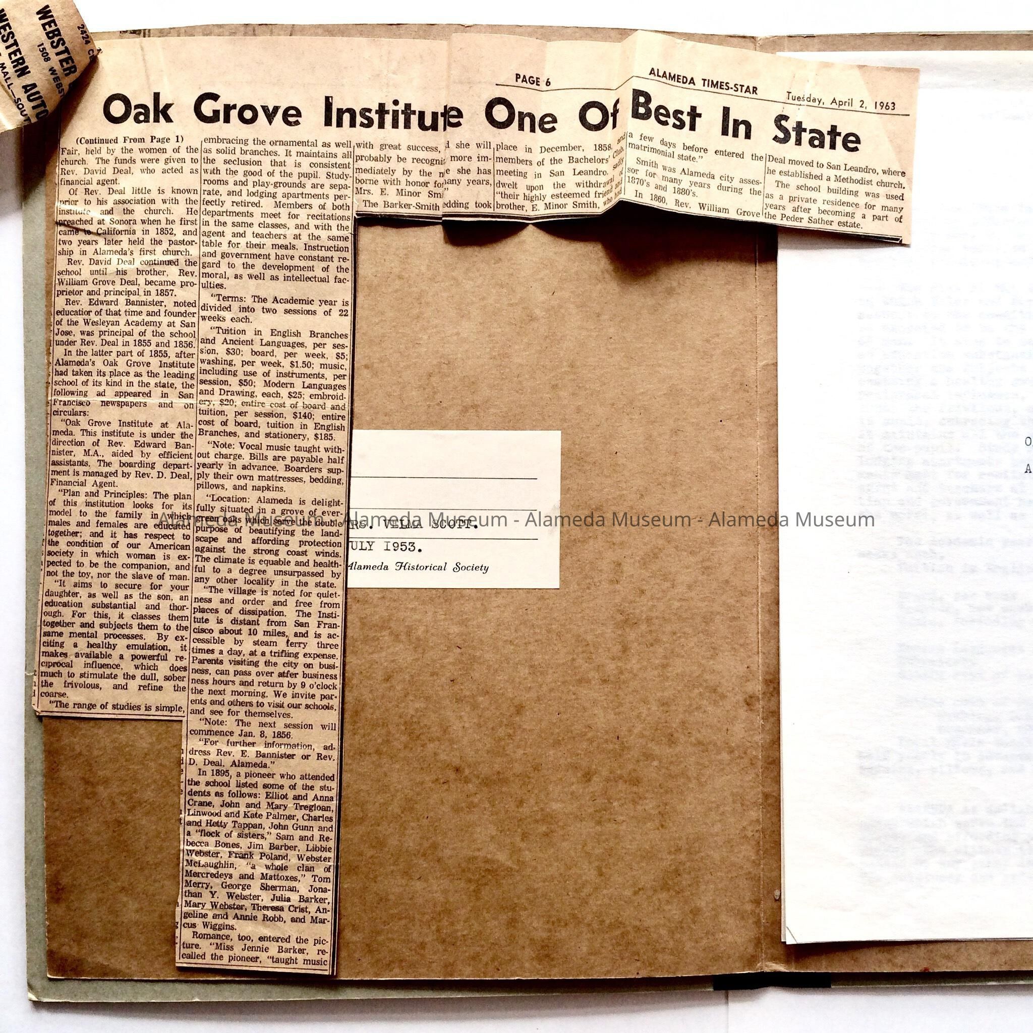 History compiled by the donor concerning the Oak Grove Institute, an early private school organized by the Methodists in 1854. Also attached is a 2-page newspaper clipping from the Alameda Times-Star dated April 2, 1963. The article relates to the institution and was also written by the donor.