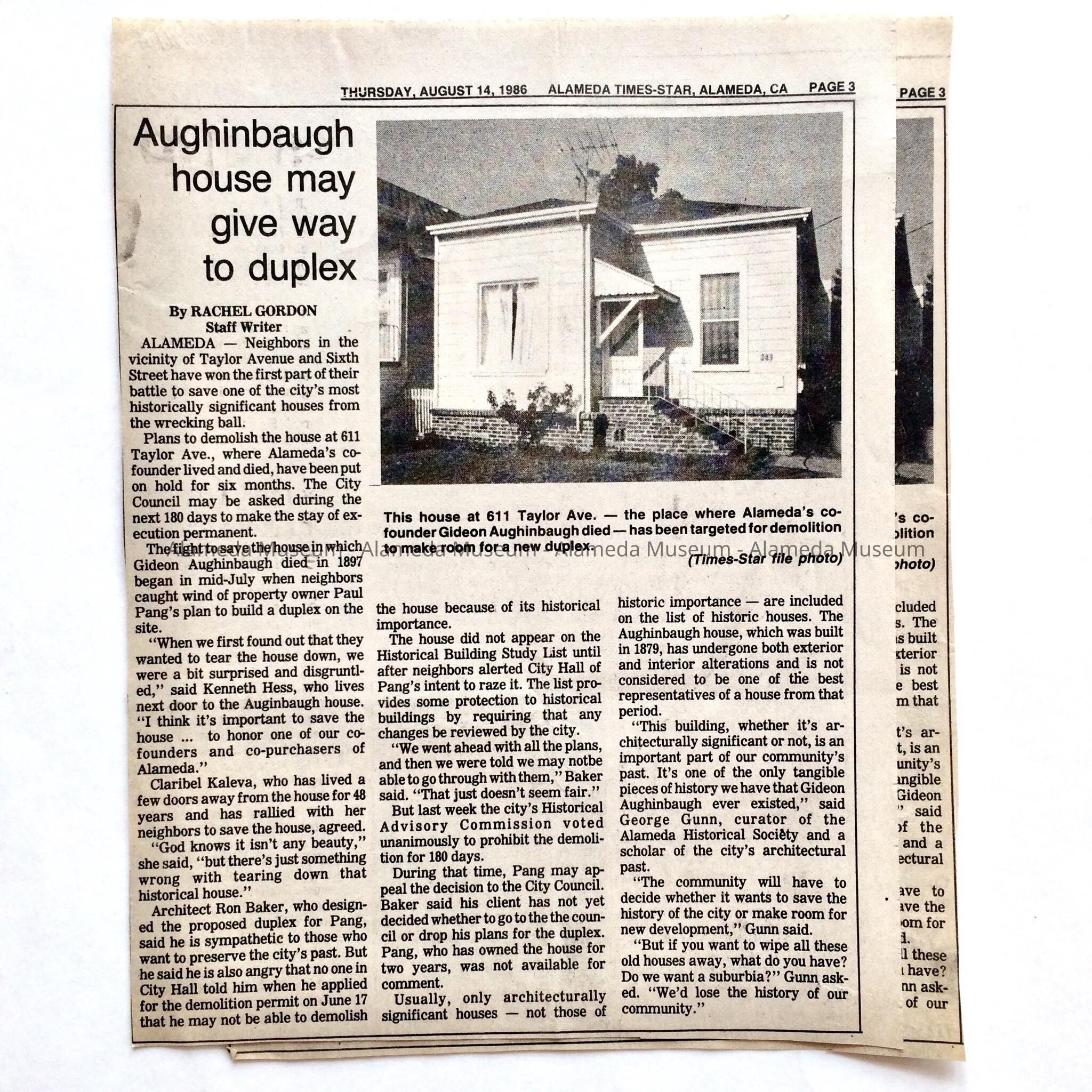 Illustrated newspaper clipping from the Alameda Times-Star dated 8/14/86 concerning the demolition of 611 Taylor Avenue. The home was originally owned by Gideon Auginbaugh, co-founder of the City of Alameda. He resided in the house in 1897.