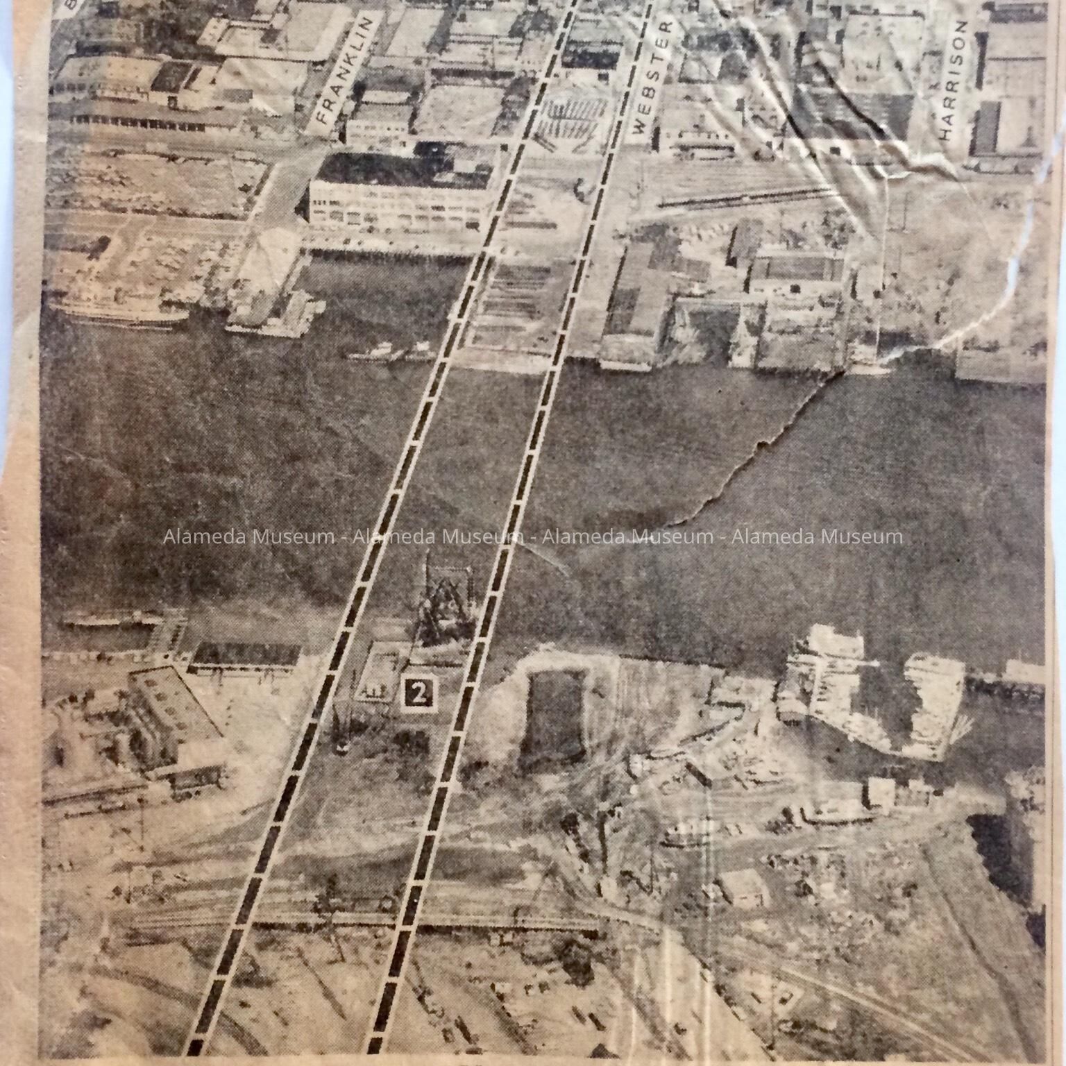 History of Object: Aerial photo taken from the Tribune Executive Aviation plane, with markings showing the line of the new Webster Street Tube, identifying 4 streets on the Oakland side, the Posey Tube portal as the outlet for Alameda, and showing the start of dredging operations on the Alameda side.