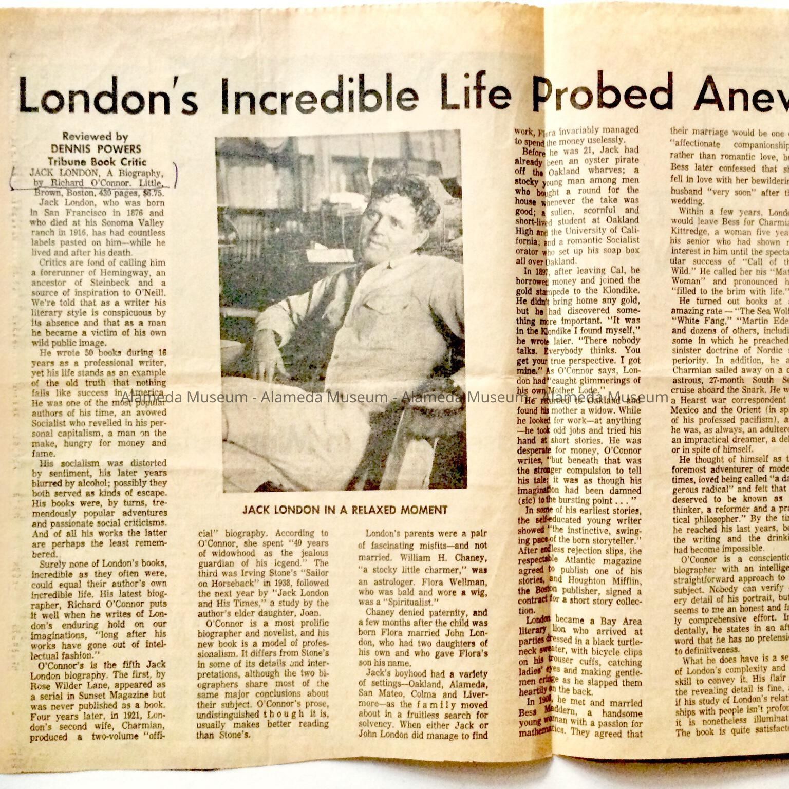 History: Review of a book concerning the life of Jack London written by Richard O'Connor with a mention of Alameda. Clipping appeared in the Oakland Tribune, October 11, 1964.