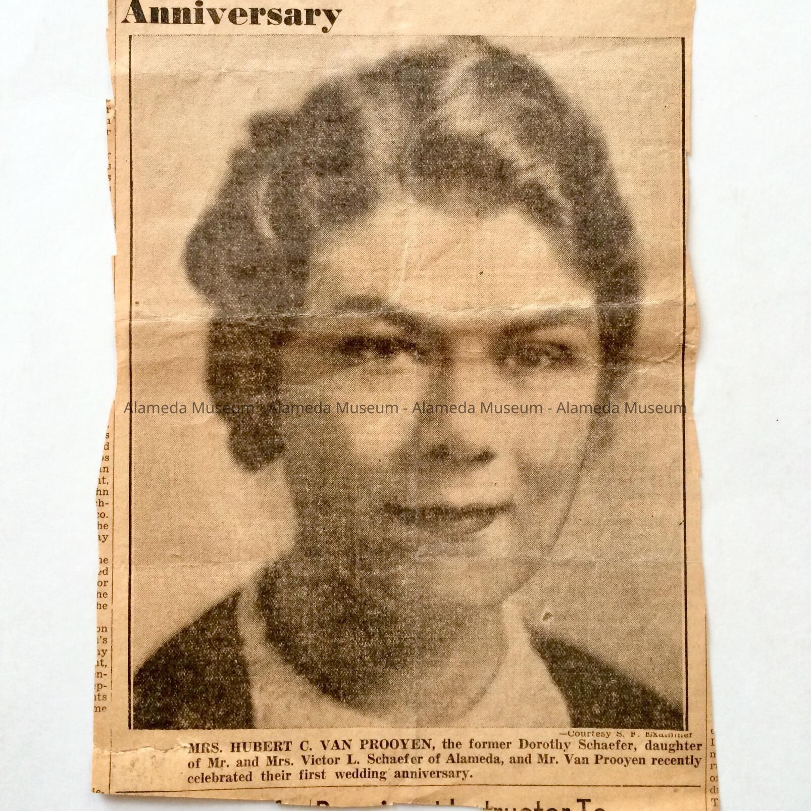 History: Newspaper clipping with portrait of Mrs. Hubert C. Van Prooyen, the former Dorothy Schaefer, daughter of Mr. and Mrs. Victor L. Schaefer. Portrait appeared in the Alameda Times celebrating her first year of marriage.