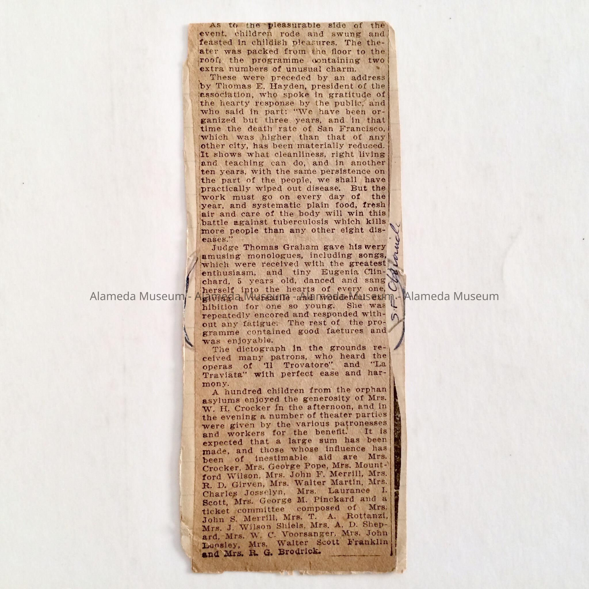 Newspaper clipping of Eugenia Clinchard's performance in San Francisco in a musical production and also states that Ms. Queenie Tilton of Alameda is the Director.