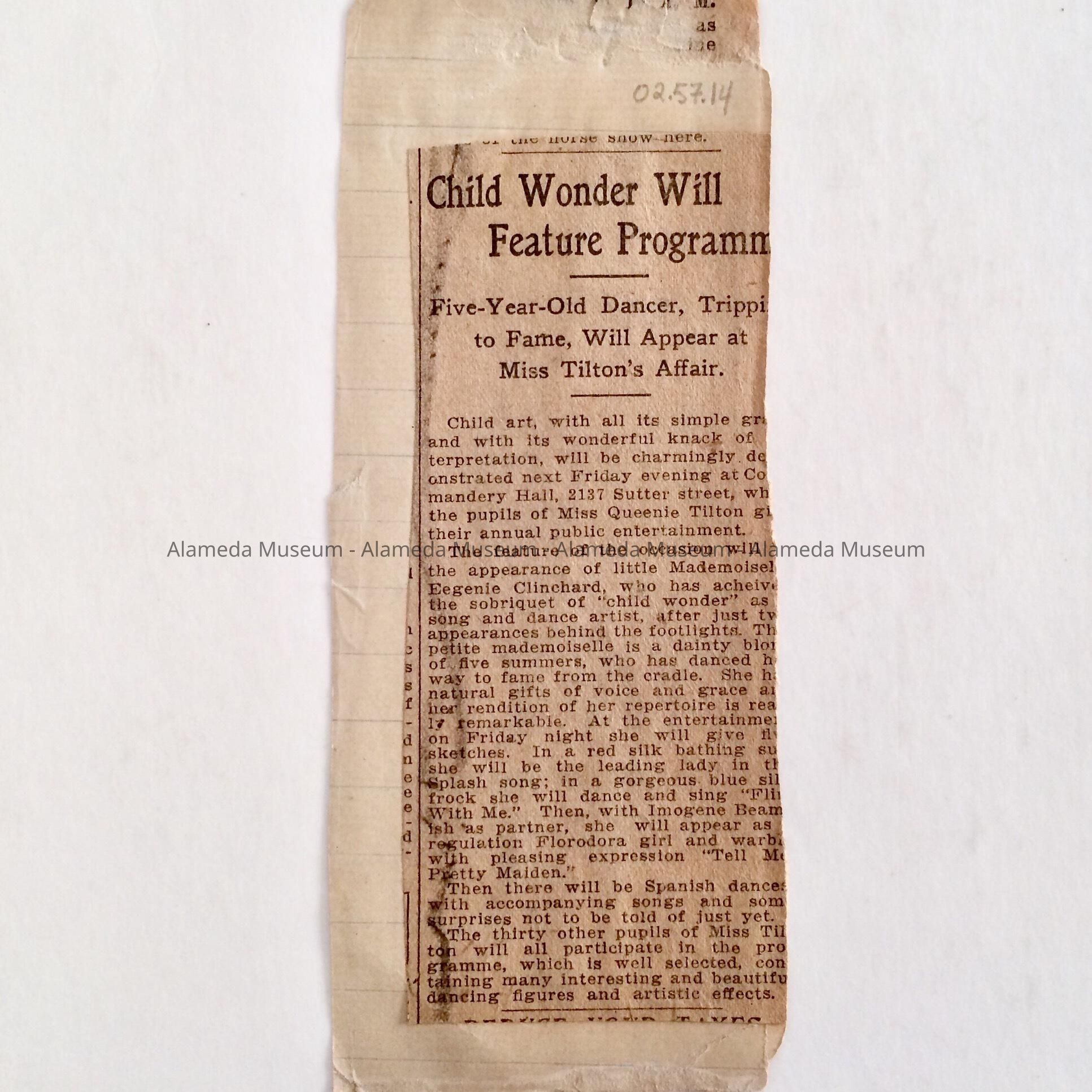 Clipping 'Child Wonder Will Feature Program' about Eugenia Clinchard, c. early 1900sEntry/Object ID