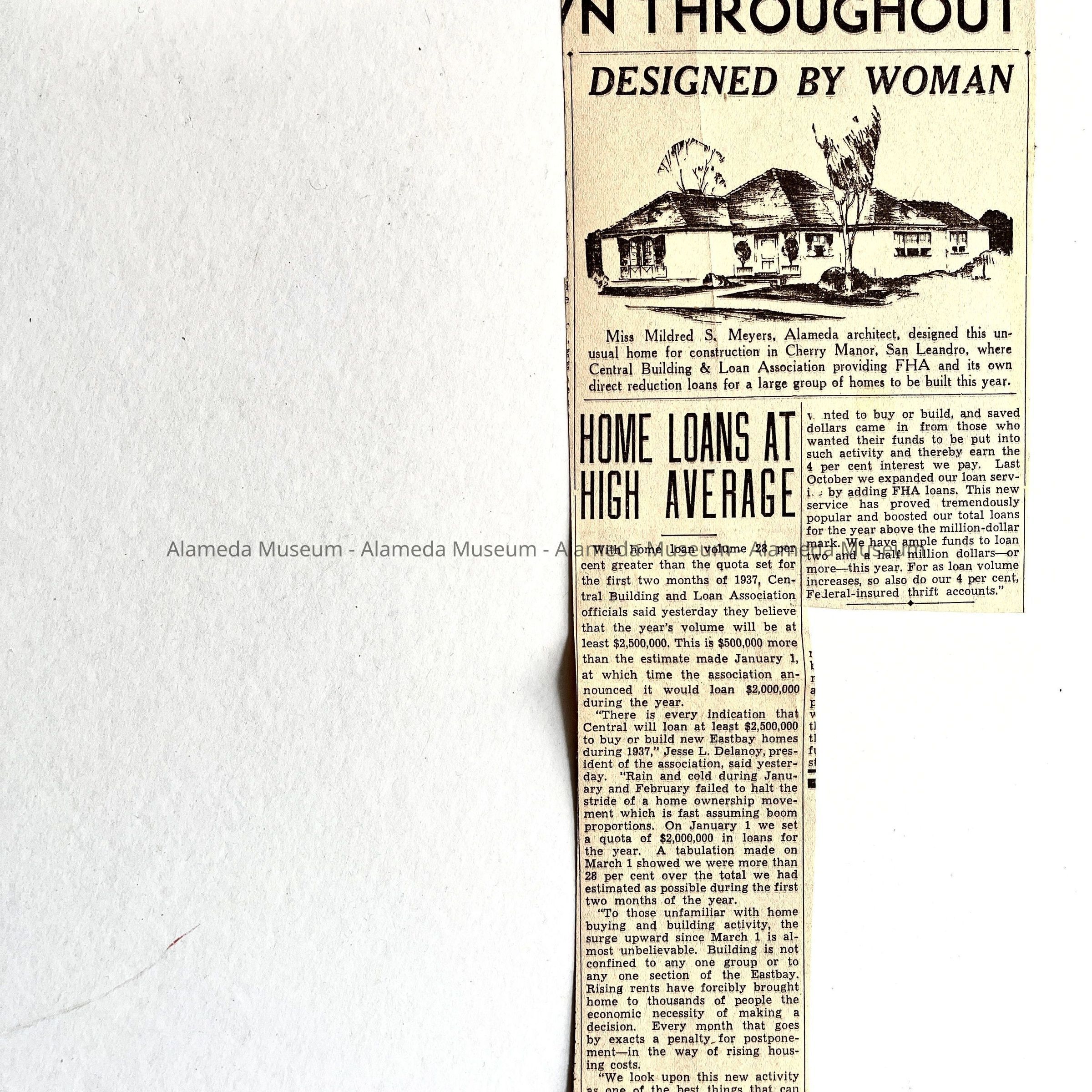 A NEWSPAPER CLIPPING THAT APPEARED IN THE OAKLAND TRIBUNE, MARCH 7, 1937, ILLUSTRATING A WOMAN'S DESIGN BY MILDRED S MEYERS, IN THE CHERRY MANOR SUBDIVISION, SAN LEANDRO.