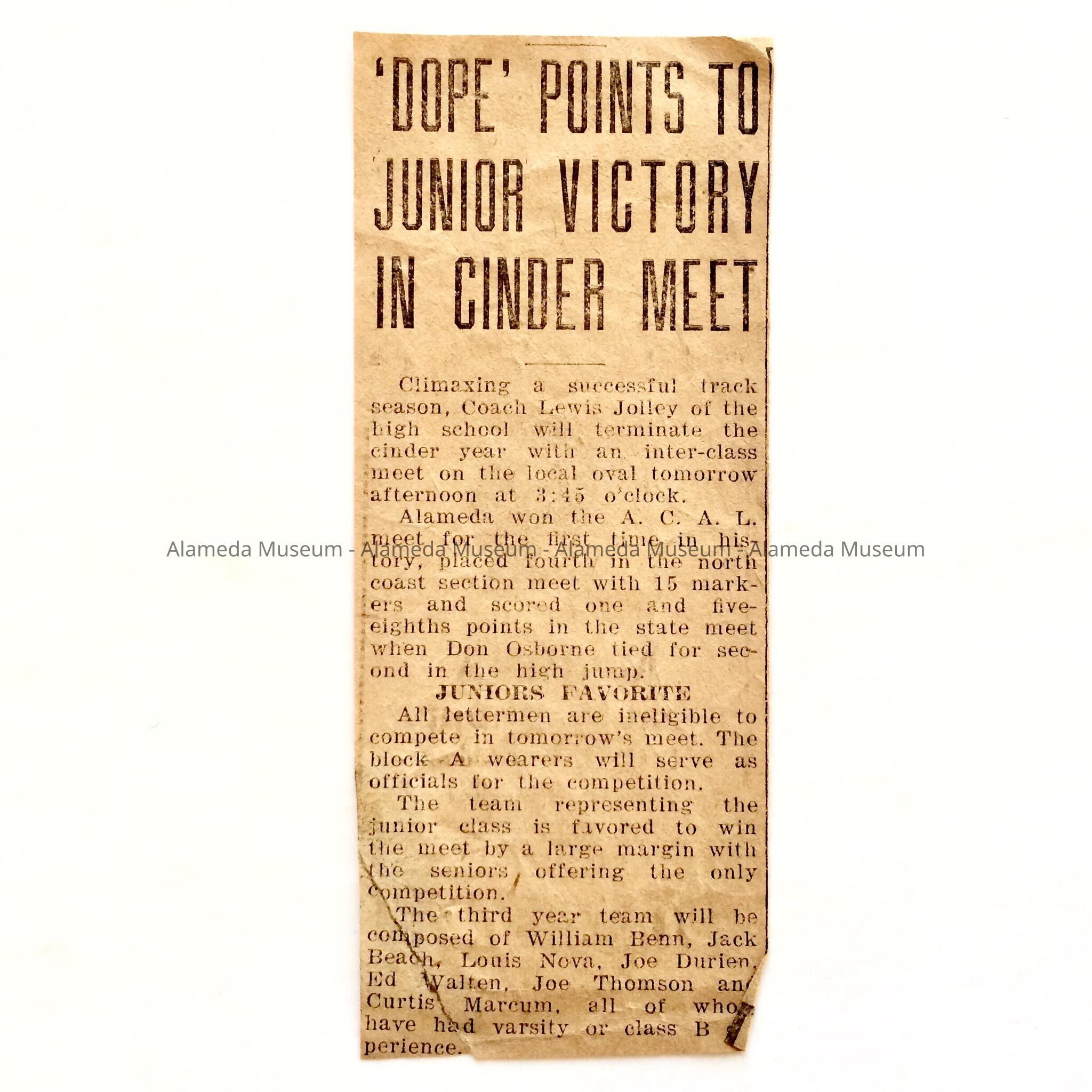 Clipping 'Dope' about Alameda High School Track meets, c. 1930Entry/Object ID