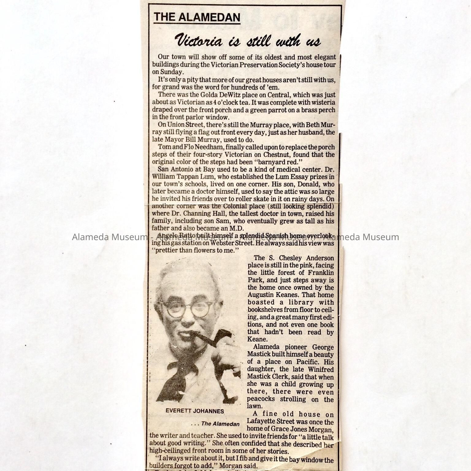 History: Newspaper clipping containing an article written by Everett Johannes concerning the Victorian houses in Alameda. Mr. Johannes was a longtime columnist.