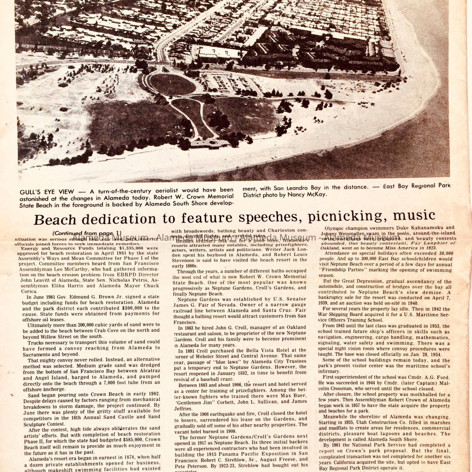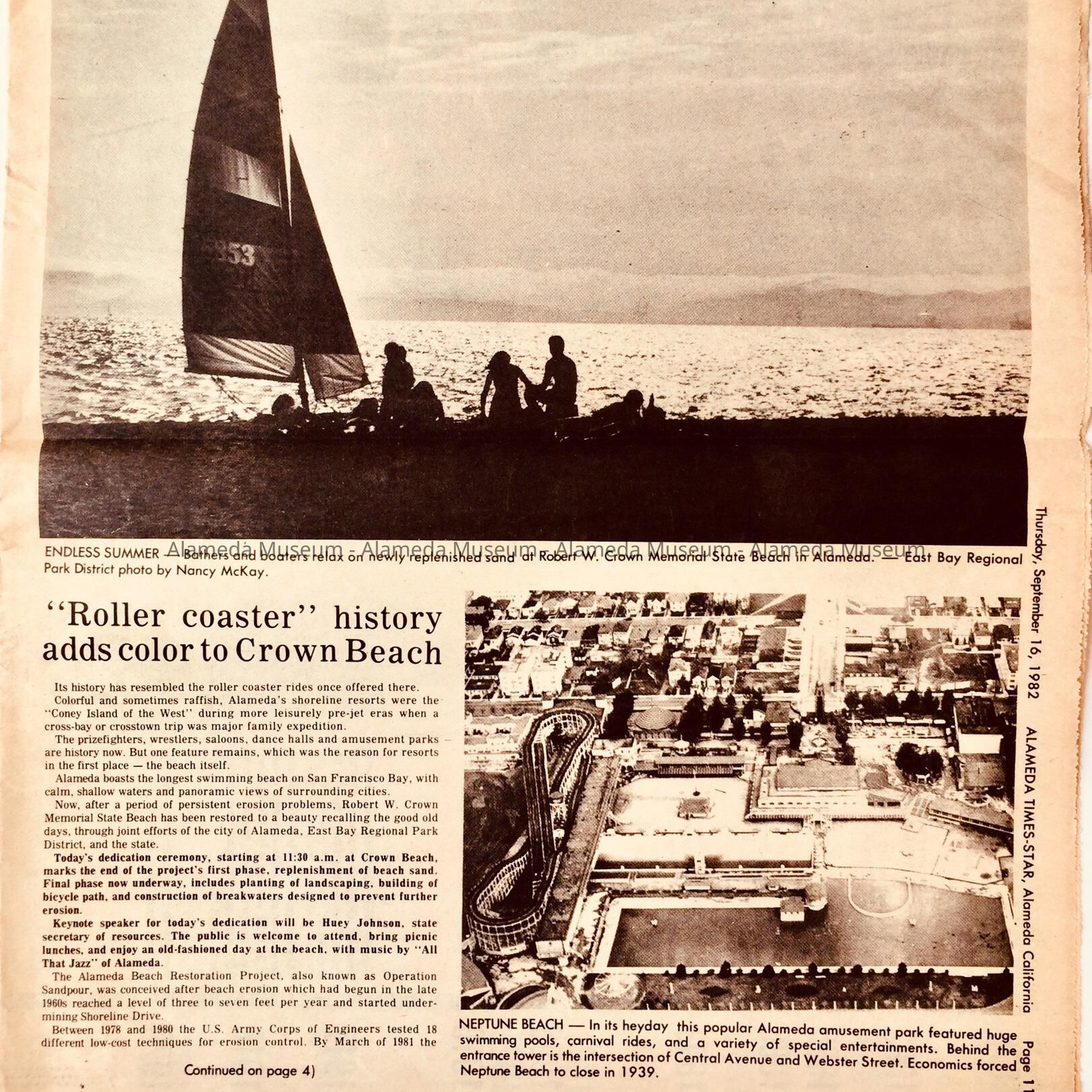 ILLUSTRATED HISTORICAL SUPPLEMENT, PUBLISHED IN COOPERATION WITH THE EAST BAY REGIONAL PARK DISTRICT, WHICH APPEARED IN THE ALAMEDA TIMES-STAR ON SEPTEMBER 16, 1982. ARTICLE ALSO CONTAINS A TIMELINE, BEGINNING WITH 1878 TO 1982, OF THE EARLY BEACHES AND ACTIVITIES THAT OCCURRED AT NEPTUNE BEACH, CROLLS' BAR, ETC. CLIPPINGS WERE RECEIVED PRIOR TO 1971 AND NOT CATALOGED UNTIL 1998.