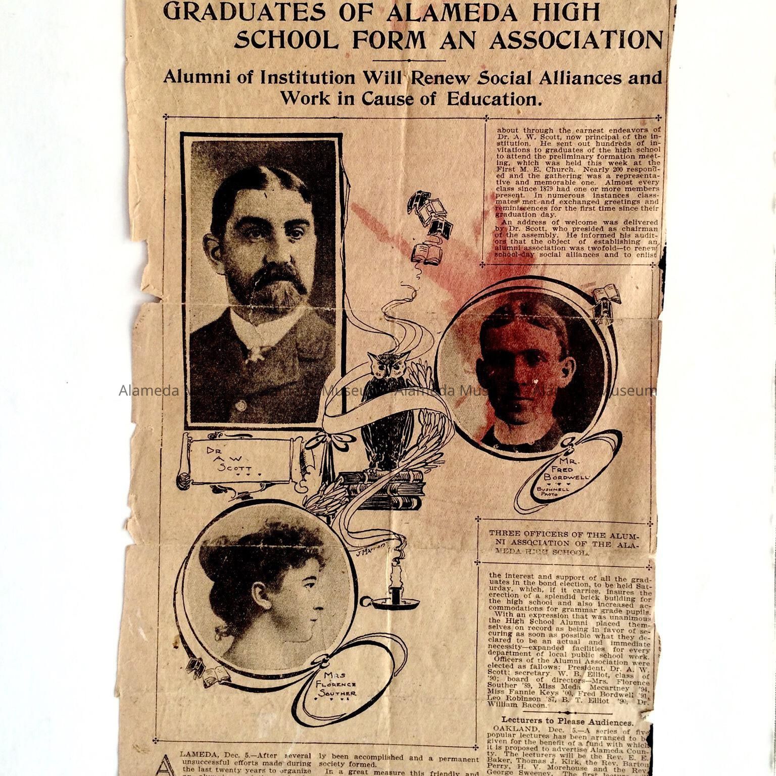 Illustrated newspaper clipping concerning graduates of Alameda High School forming an alumni of past graduates. Clipping appeared in a San Francisco newspaper December 6, 1901.