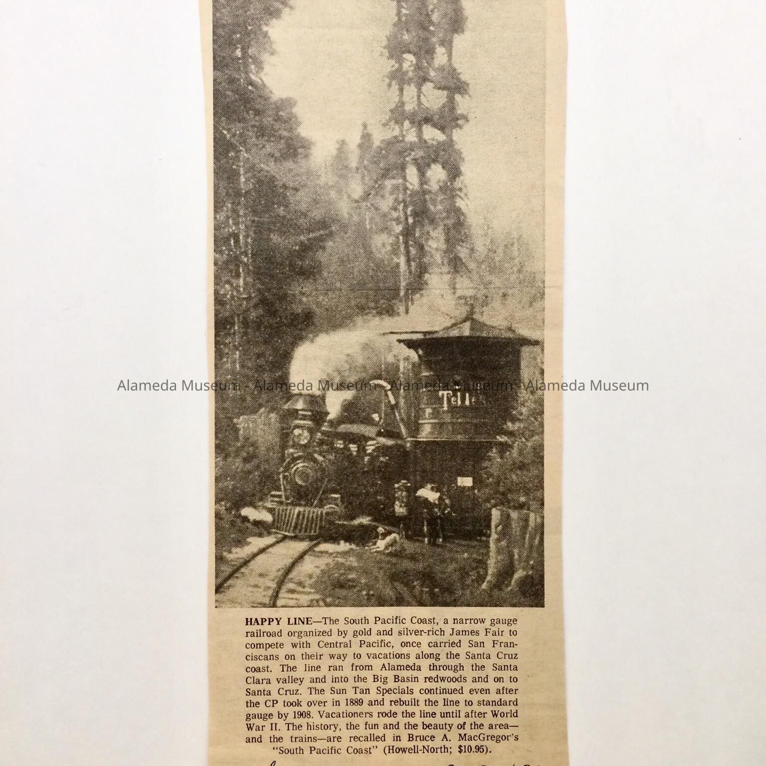 Illustration of a Southern Pacific Coast Steam Engine. The line ran from Alameda to Santa Cruz.