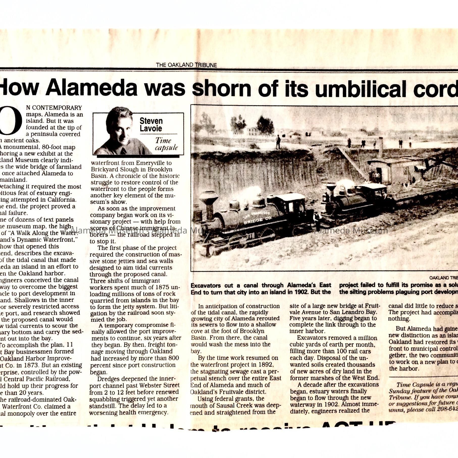 NEWSPAPER CLIPPING THAT APPEARED IN THE OAKLAND TRIBUNE; AUTHORED BY STEVEN LAVOIE CONCERNING THE EXCAVATION OF THE TIDAL CANAL WHICH EVENTUALLY SEPARATED ALAMEDA FROM OAKLAND.