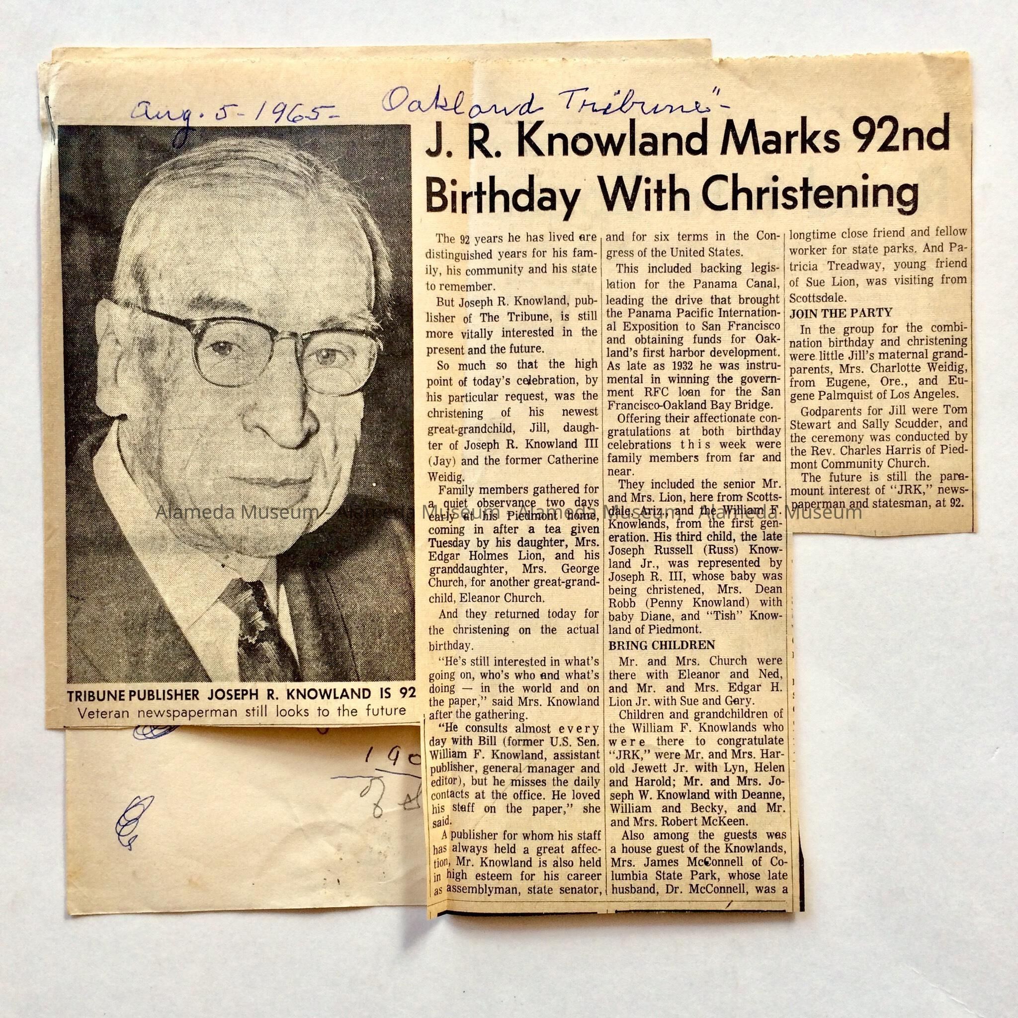 History: Newspaper clipping concerning the 92nd birthday of J.R. Knowland. Knowland, the Oakland Tribune publisher, was born in Alameda in 1873.