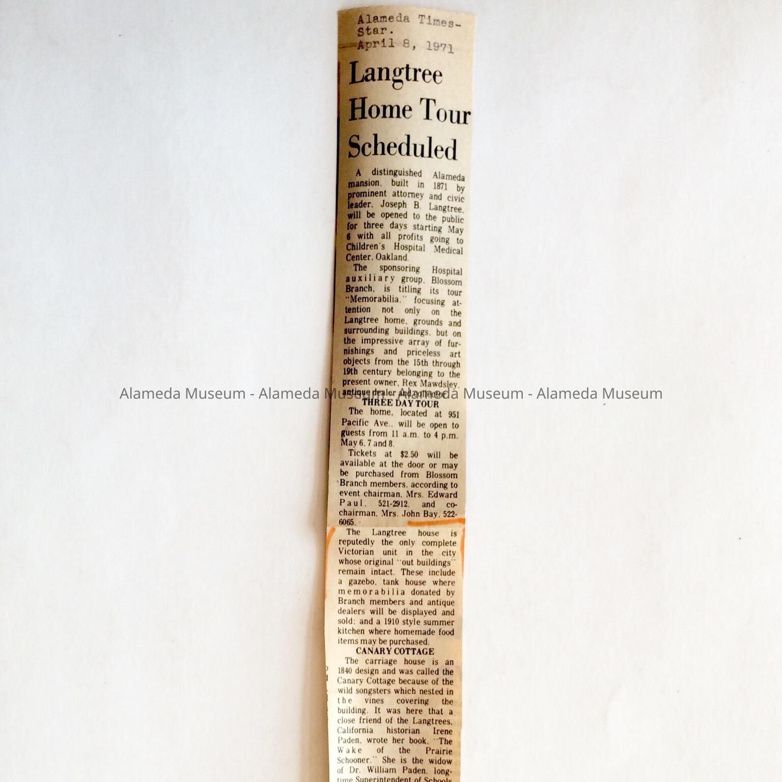 Clipping 'Langtree Home Tour Schedule', 951 Pacific Ave, 1971Entry/Object ID