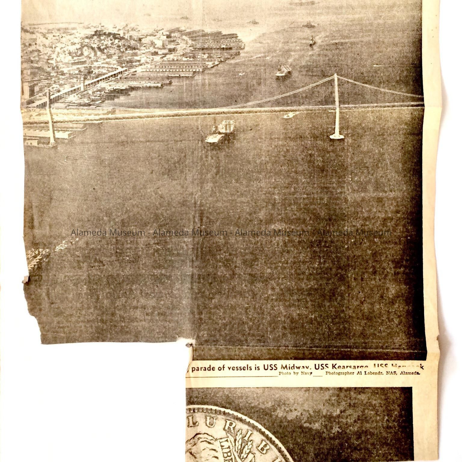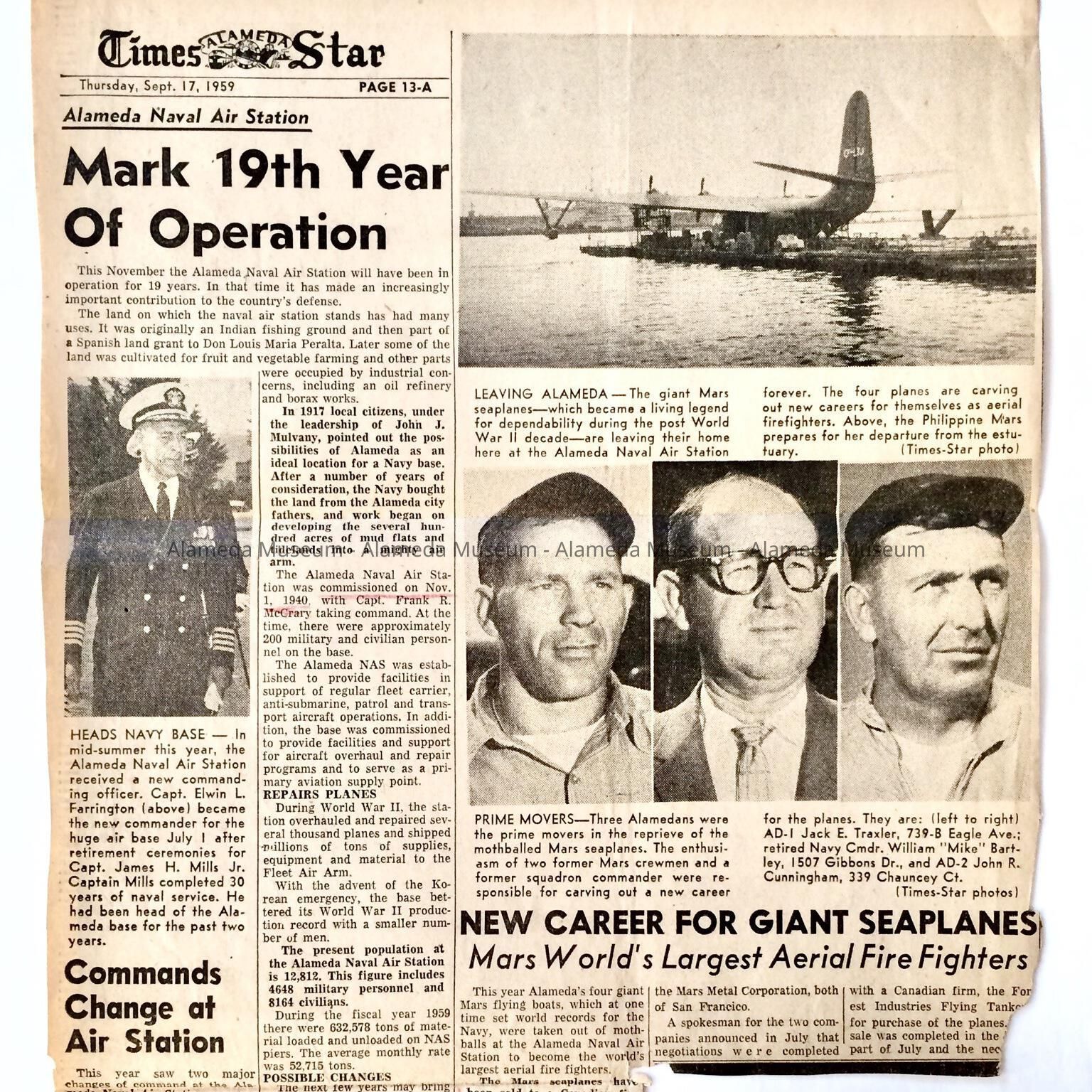 History: Newspaper clipping concerning the history and operation of the Alameda Naval Air Station, which appeared in the Alameda Times Star September 17, 1959. Clipping also includes an article on the Mars Sea Planes which were used during World War II and took off from Alameda.