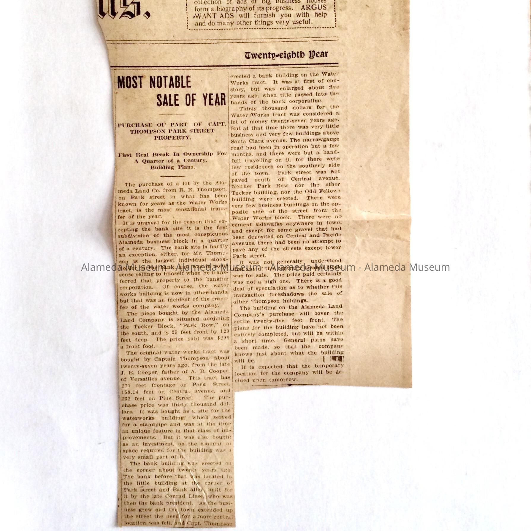 History: Newspaper clipping from the Alameda Daily Argus of September 18, 1905, concerning land on Park Street being purchased by the Alameda Land Company.