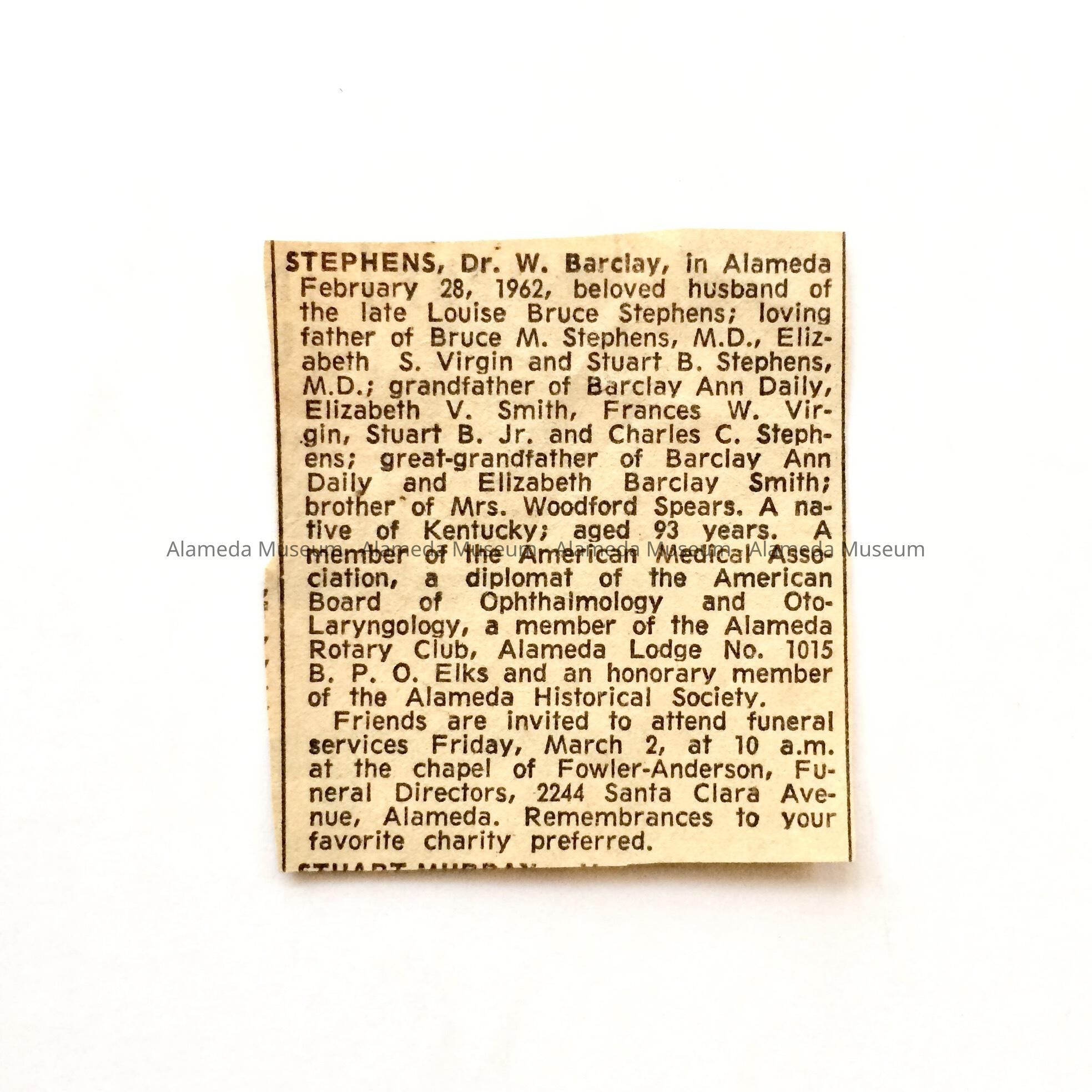 AN OBITUARY NOTICE CONCERNING THE DEATH OF DR W BARCLAY STEPHENS, ON FEBRUARY 28, 1962, IN ALAMEDA. HE WAS A LONG-TIME RESIDENT OF ALAMEDA AND PRACTICING PHYSICIAN. HE HAD BEEN AN HONORARY MEMBER OF THE ALAMEDA HISTORICAL SOCIETY. DR STEPHENS WAS ALSO AN EXPERT ON CLOCKS.