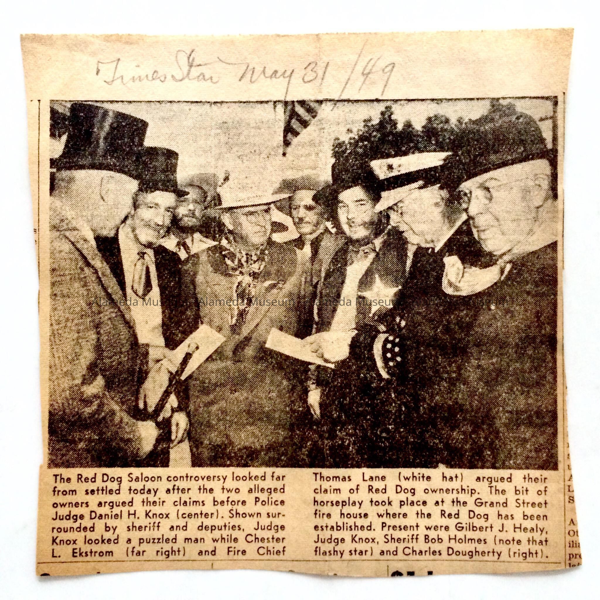 A NEWSPAPER CLIPPING, SHOWING MEMBERS PARTICIPATING IN THE 1949 PIONEER DAY CELEBRATION IN ALAMEDA. SOME OF THE PARTICIPANTS PICTURED INCLUDED A FORMER FIRE CHIEF, THOMAS LANE, JUDGE DANIEL H KNOX, AND OTHERS.
