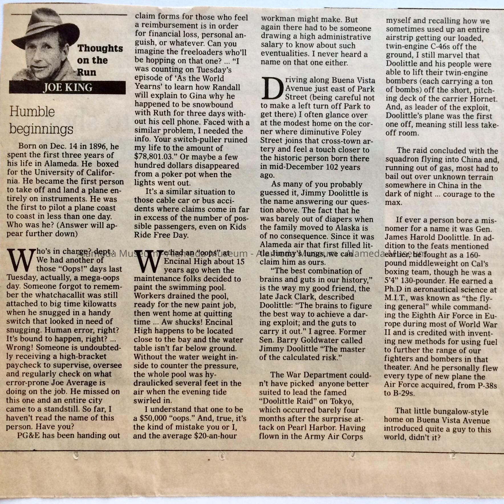 A NEWSPAPER CLIPPING FROM THE ALAMEDA JOURNAL, AUTHORED BY JOE KING, CONCERNING JIMMY DOOLITTLE WHO WAS BORN IN ALAMEDA. HE WAS FAMOUS FOR HIS WW-II EXPLOITS.