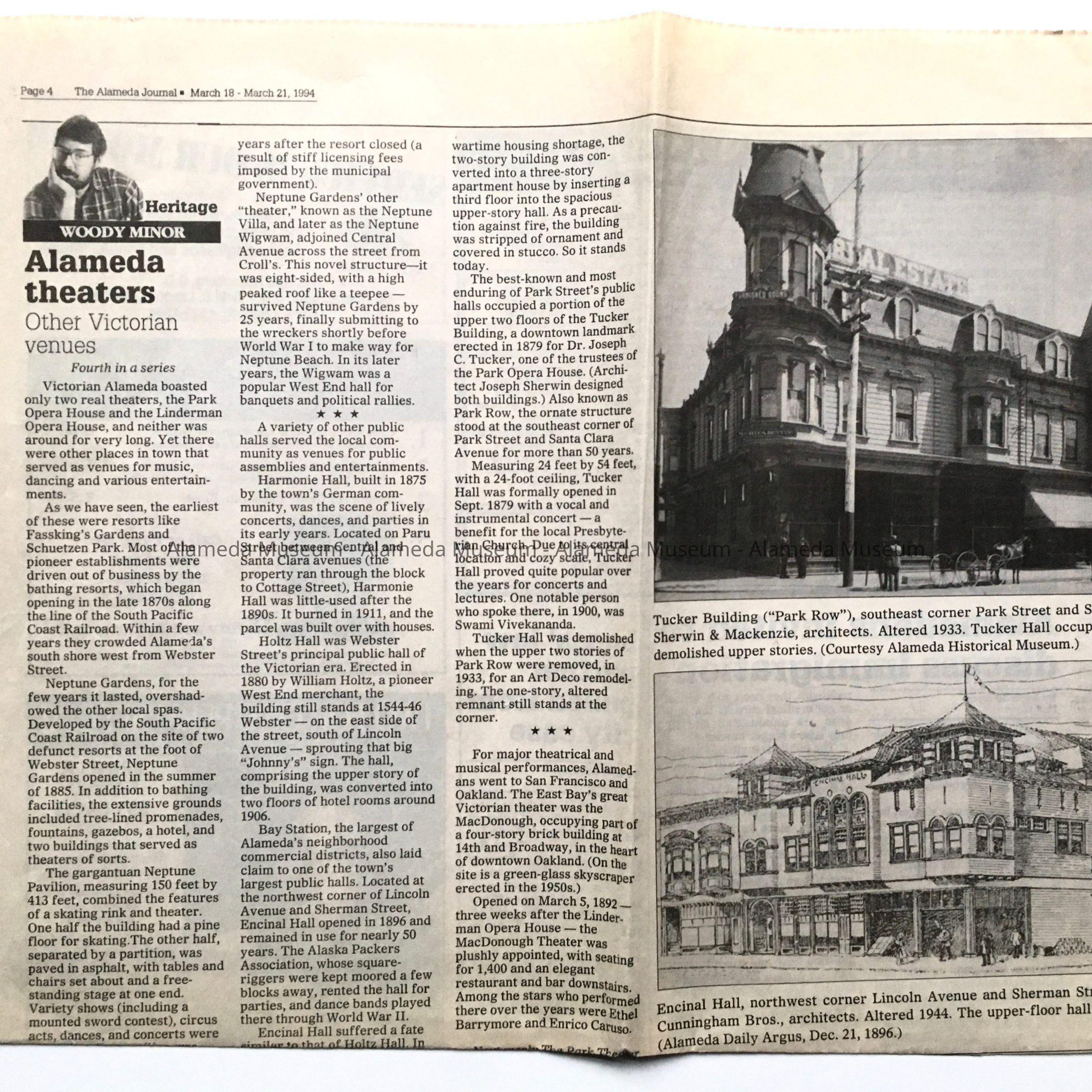 A NEWSPAPER CLIPPING OF AN ARTICLE WRITTEN BY WOODY MINOR CONCERNING THE VICTORIAN THEATRES AND HALLS IN ALAMEDA.
