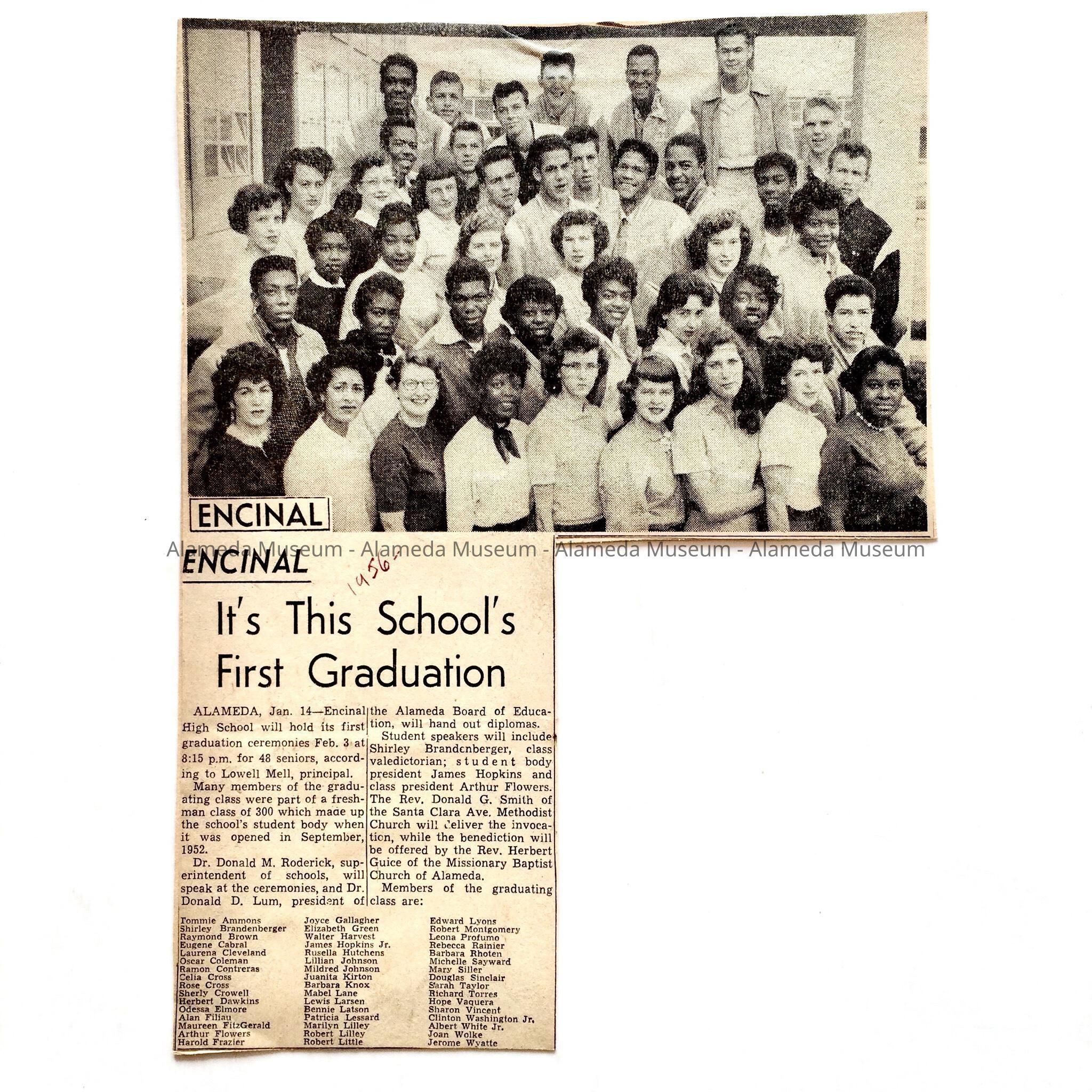 An illustrated newspaper clipping with photograph of the graduates of the first graduating class of Encinal High School 1956. The clipping also lists the graduates.