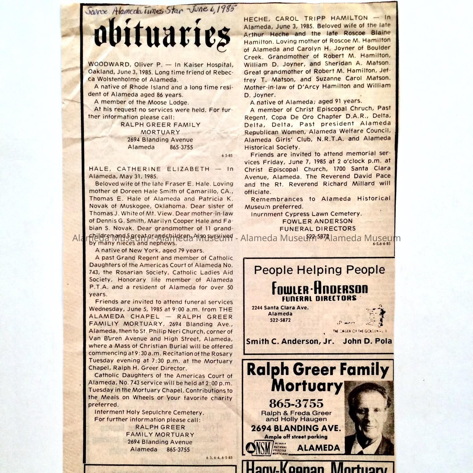 DESCRIPTION: A CLIPPING FROM THE "ALAMEDA TIMES-STAR," JUNE 6, 1985. CLIPPING IS TITLED, "OBITUARIES."