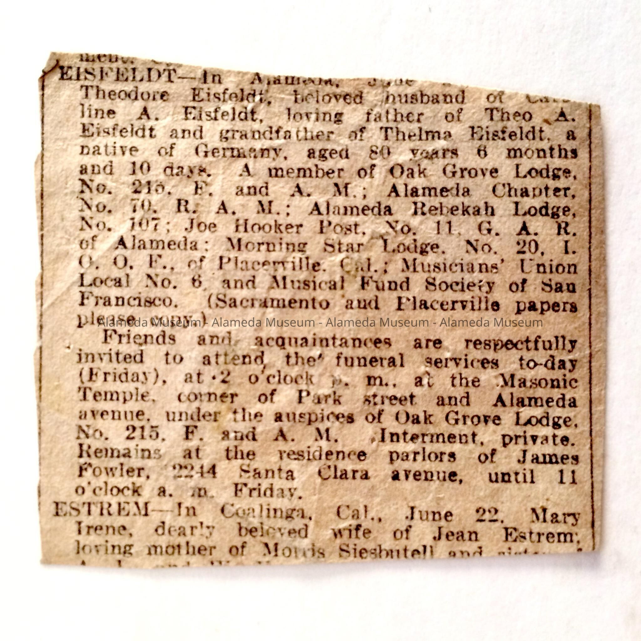 History of Object: Obituary notice of Theodore Eisfledt, a professional musician and early resident of Alameda.