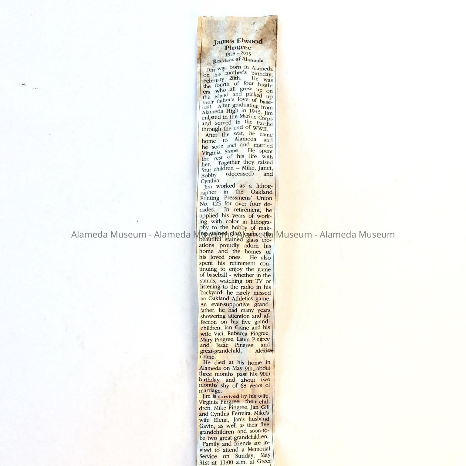 History of Object: Clipping of Obituary of James Elmwood Pingree, born February 28.1915, graduating from Alameda High School in 1943. After graduation he served in the Pacific, then came home to Alameda, married Virginia Stone, and raised a family. He was employed as a lithographer in Oakland, and died in Alameda, May 9, 2015.