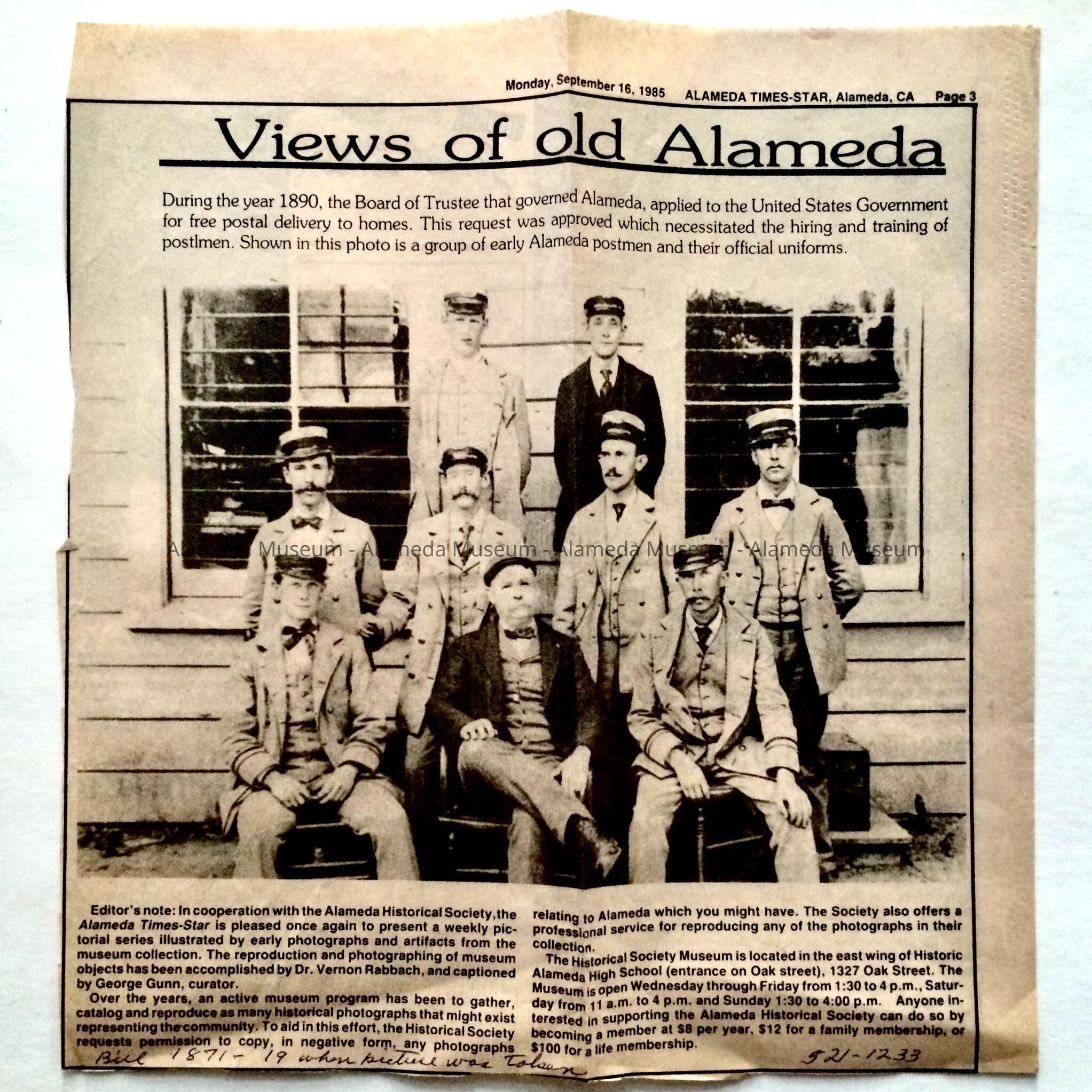 History: clipping from the Alameda Times Star dated September 16, 1985 with a reproduced photograph of the early Alameda City Postmen in uniform.