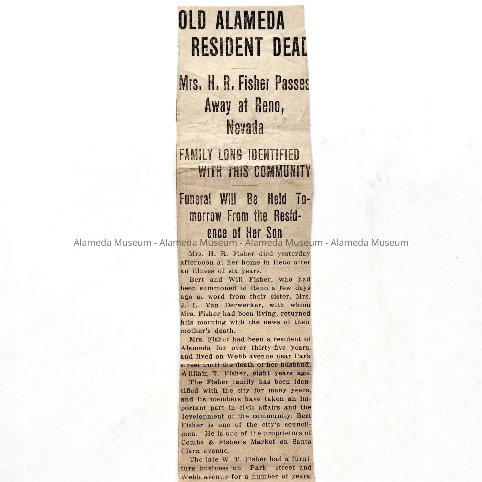 History: Newspaper clipping concerning the death of Mrs. H.R. Fisher who was a resident of Alameda for 35 years and lived on Webb Avenue near Park Street.. She was the wife of William T. Fisher. The late William Fisher had a furniture business on Webb Avenue and Park Street. She had four children: Burt L., councilman and proprietor of Combs and Fisher Market on Santa Clara Avenue, William J., Edward T., and Mrs. J. L. Van Der Werker.
