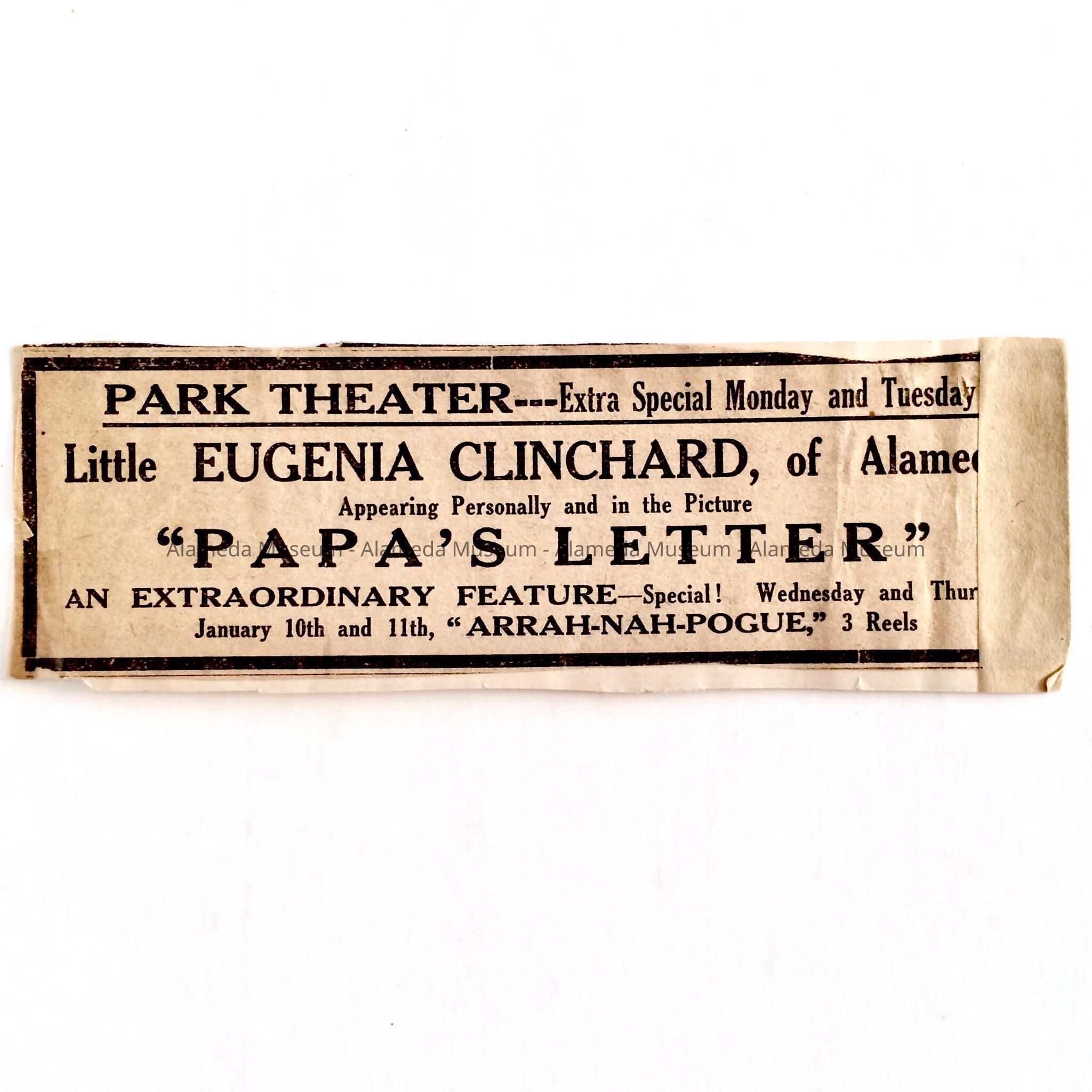 Newspaper clipping advertising the appearance of Eugenia Clinchard of Alameda, performing in the motion picture, “Papa's Letter" at the Park Theatre, Alameda.