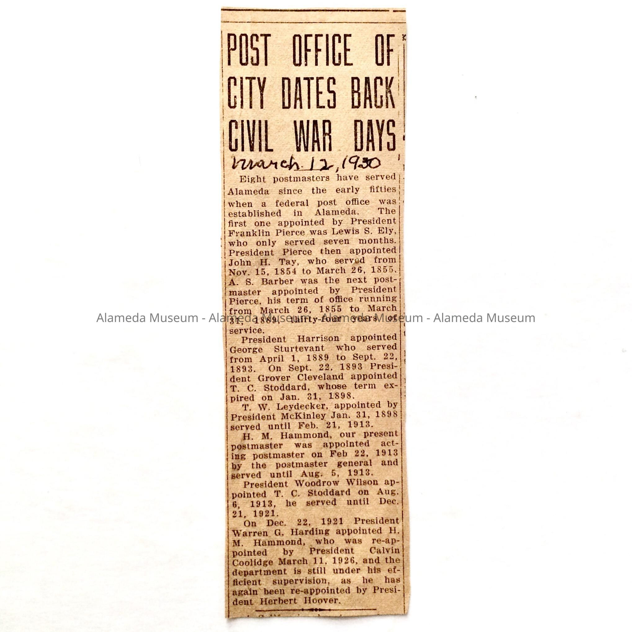 Clipping concerning the early postmasters of the City of Alameda from 1854-1926.