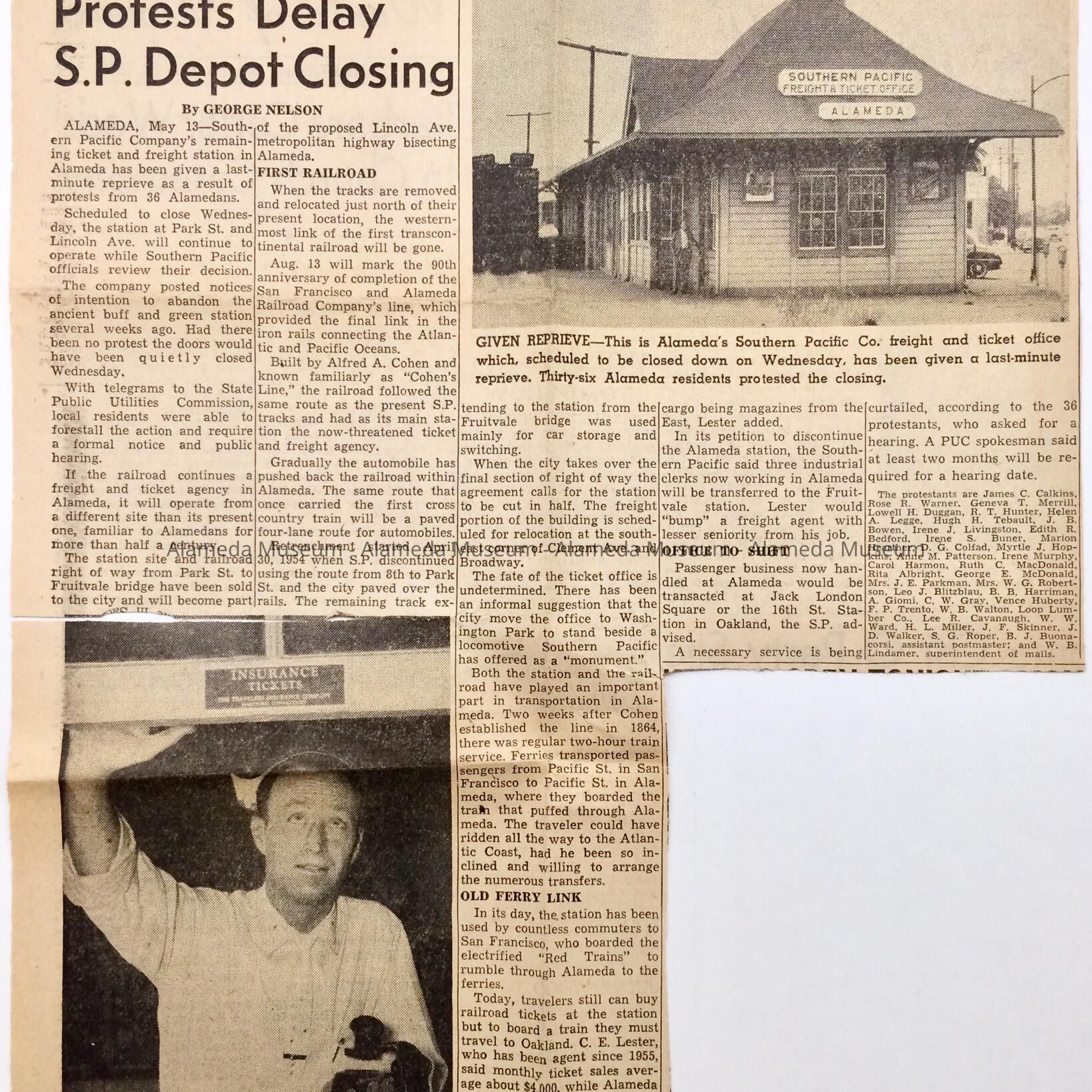 Description: Illustrated newspaper clipping with bold printed caption "Protest Delay Southern Pacific Depot Closing".