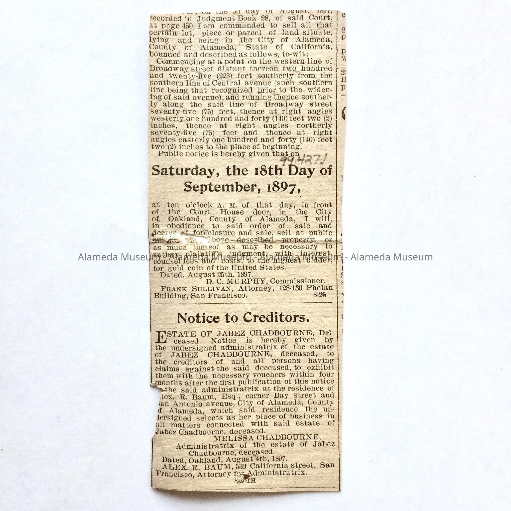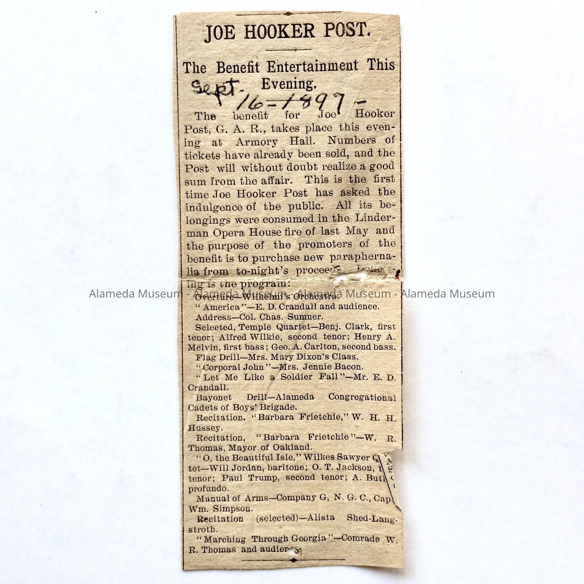 Description: Clipping, partly torn, titled 'Joe Hooker Post. The Benefit Entertainment This Evening'. Handwritten in what appears to be black ballpoint pen is the date 'Sept. 16-1897'.