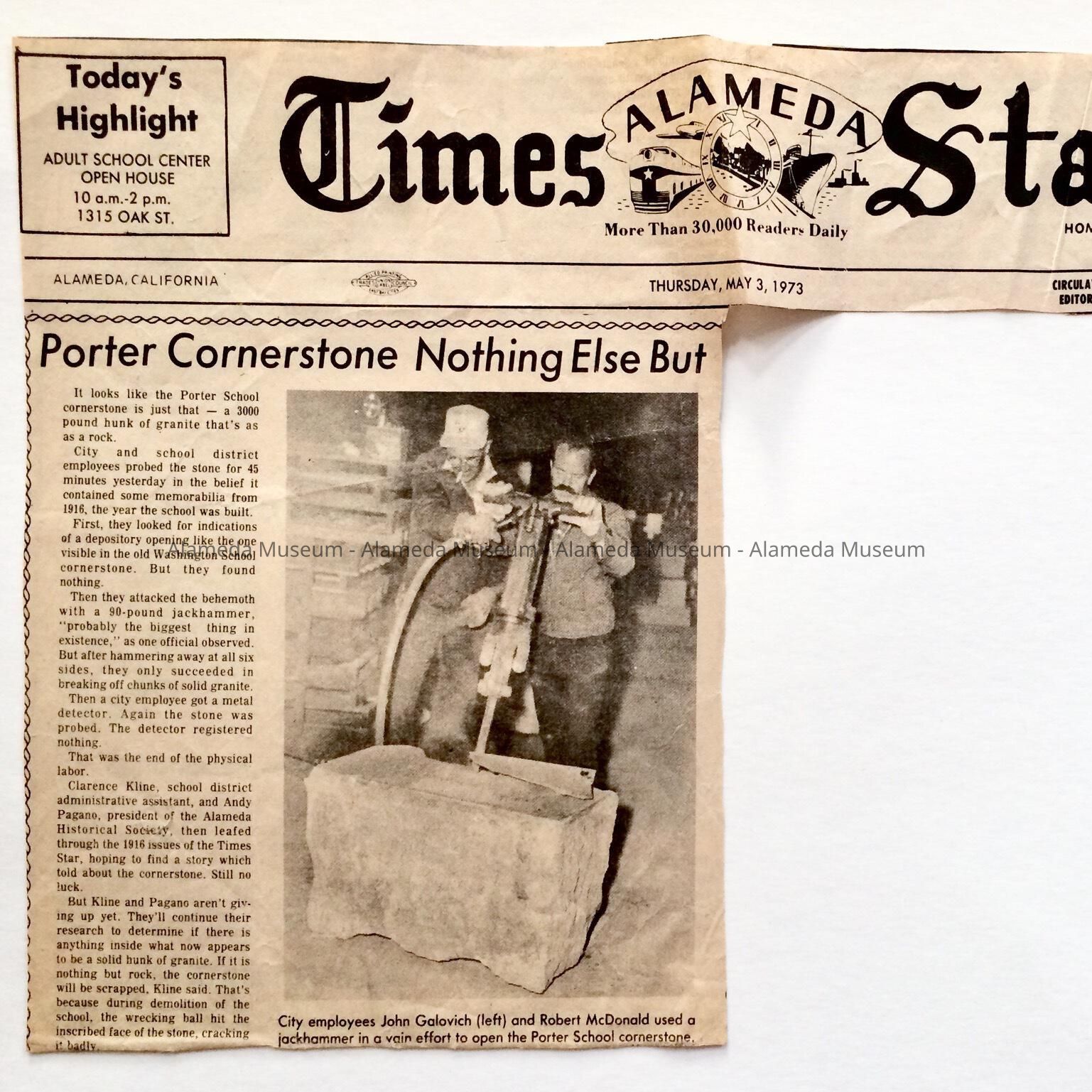 HISTORY OF OBJECT: NEWSPAPER CLIPPING CONCERNING THE CORNERSTONE OF PORTER SCHOOL, WHICH WAS DESTROYED BY FIRE IN MARCH 1973.