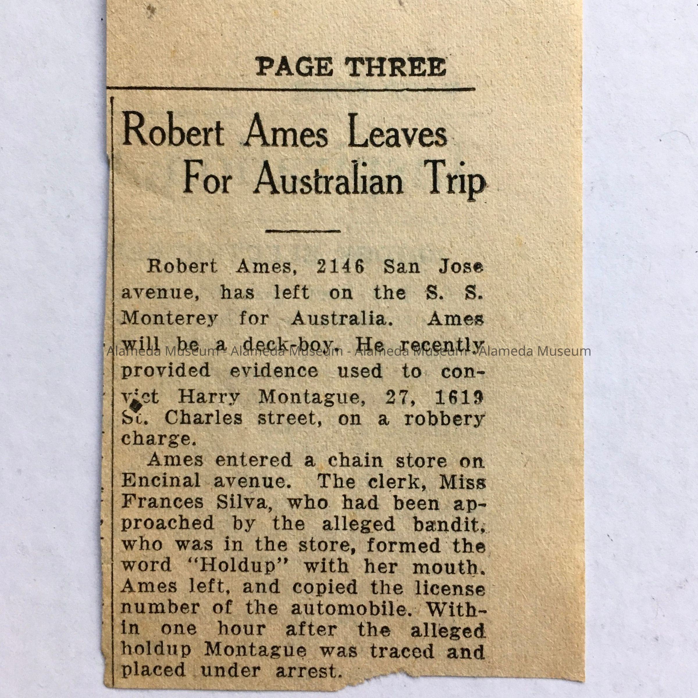 History of Objects: clipping reporting on a trip to Australia, taken by Robert Ames, and mentioning his action that led to apprehension of Harry Montague, of 1619 St. Charles Street, during a hold-up in a store on Encinal Ave. Robert returned in December 1933.