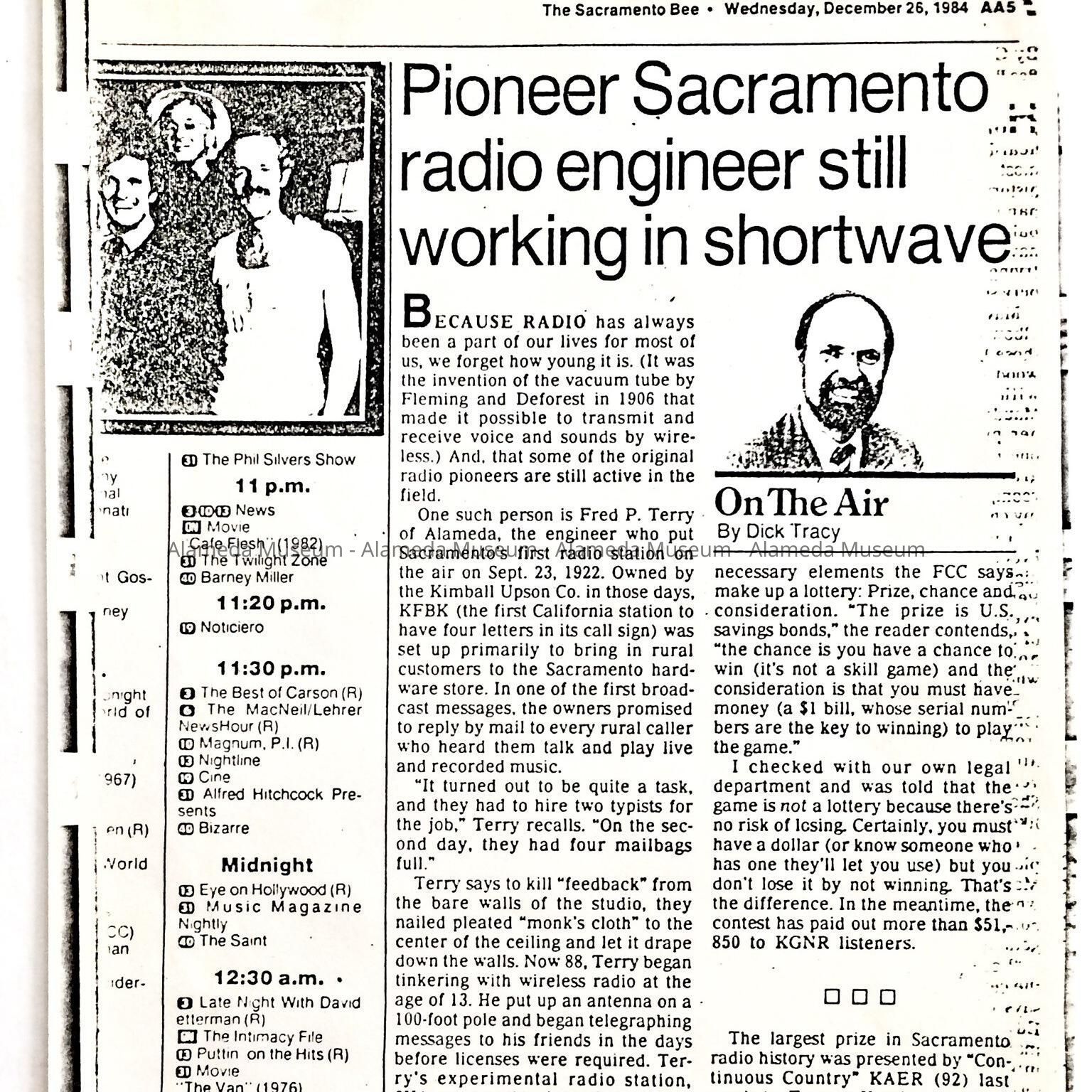 Clipping resident Fred P. Terry, founder of a Sacramento Radio Station, 1984Entry/Object ID