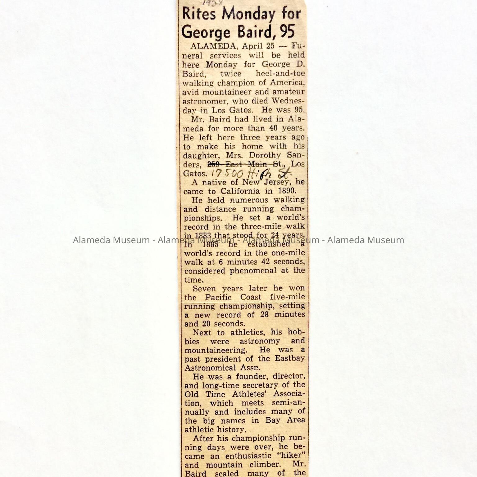 History: Obituary concerning the late George Baird, longtime resident of Alameda and a noted athlete.