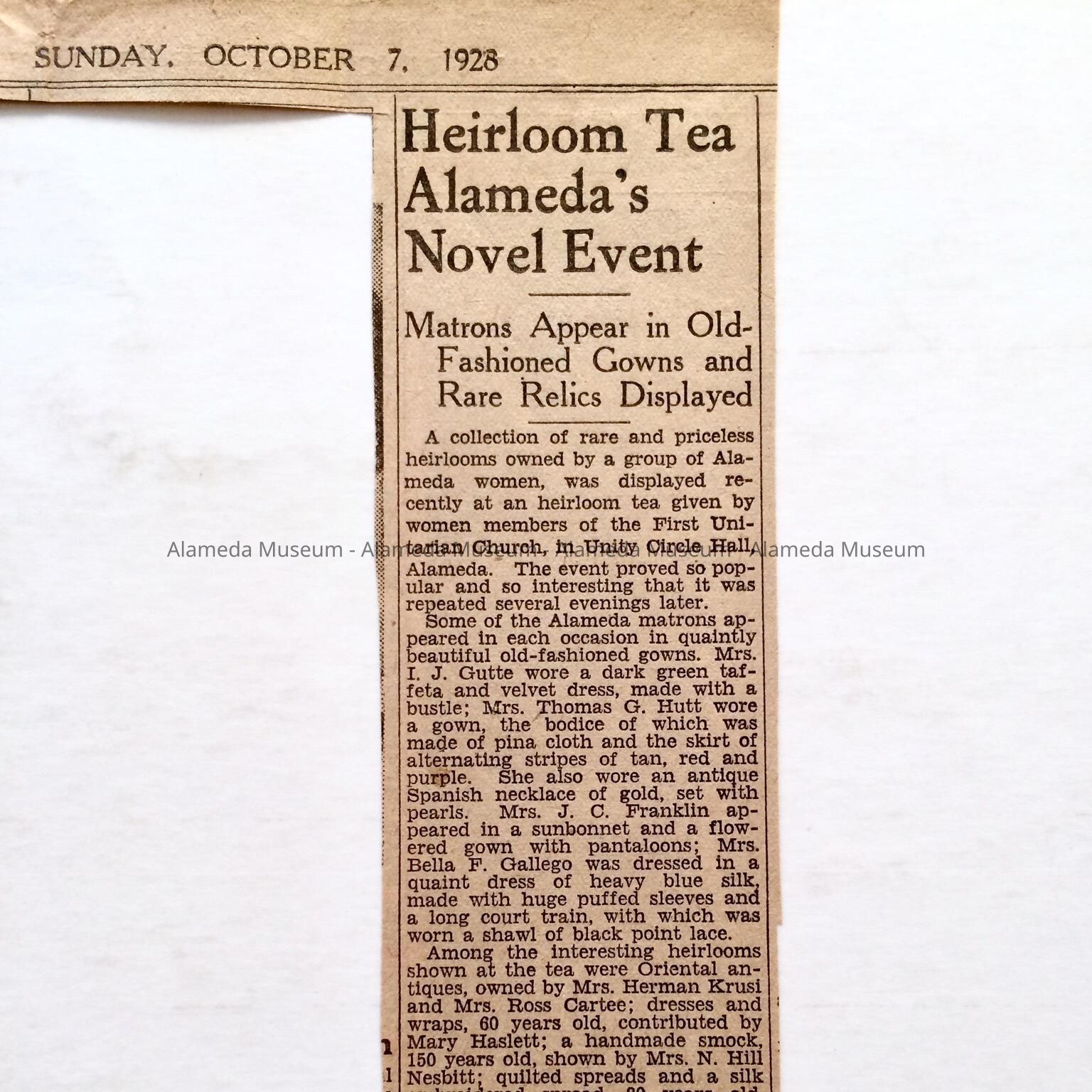Clipping S.F. Chronicle about 'Heirloom Tea Alameda's Novel Event', 1928Entry/Object ID