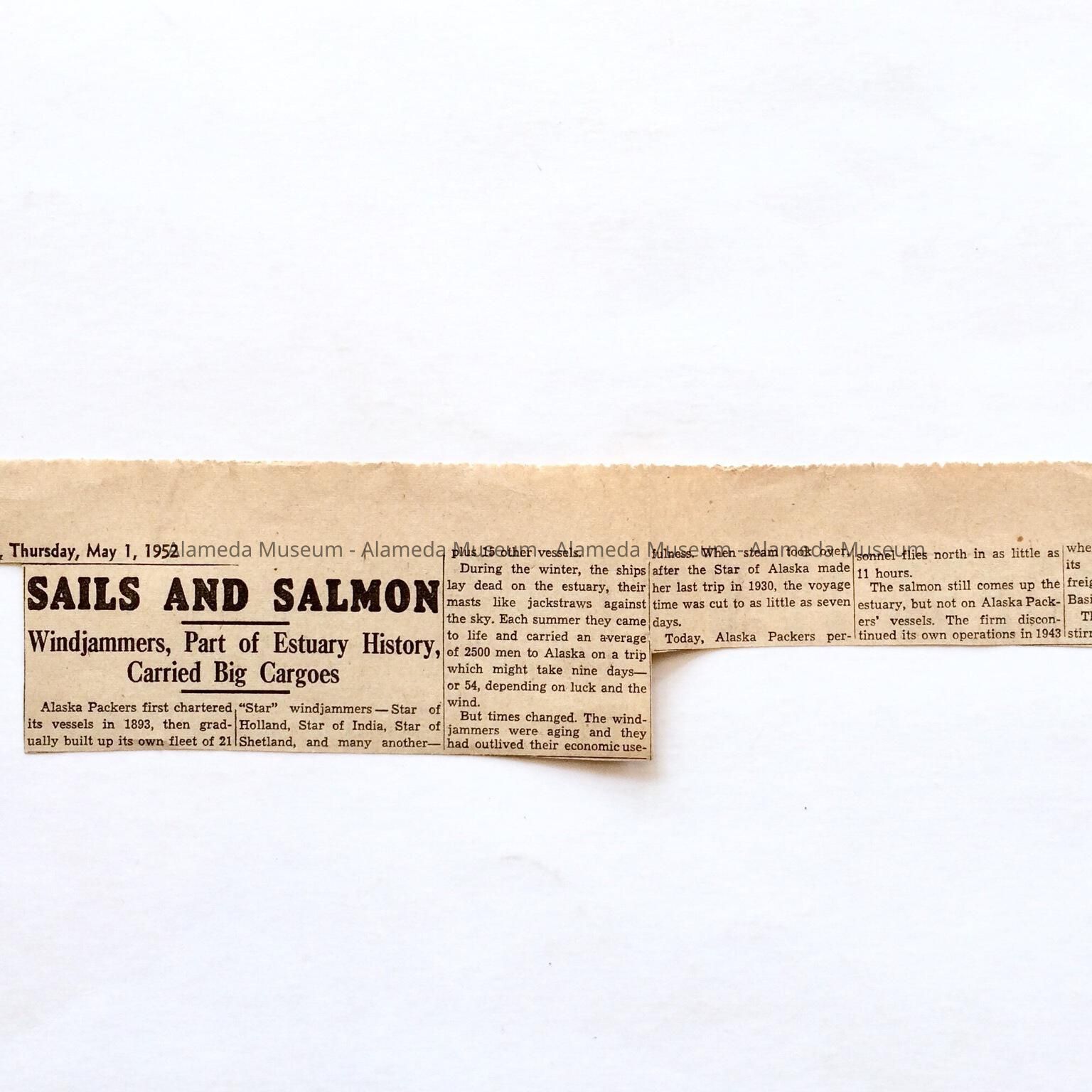History: Clipping from the Oakland Tribune of May 1, 1952 concerning the fleet of the Alaska Packers.
